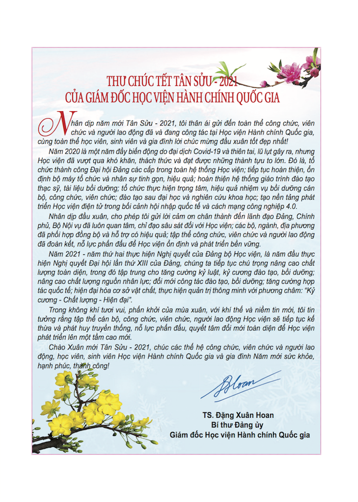 (Quanlynhanuoc.vn) – Nhân dịp bước sang năm mới 2021 và đón Tết cổ truyền Tân Sửu, TS. Đặng Xuân Hoan – Bí thư Đảng uỷ, Giám đốc Học viện Hành chính Quốc gia đã gửi Thư chúc mừng đến toàn thể công chức, viên chức và người lao động đã và đang công tác tại Học viện Hành chính Quốc gia, cùng toàn thể học viên, sinh viên và gia đình lời chúc mừng đầu xuân tốt đẹp nhất!