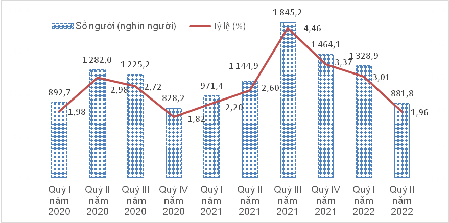 Do đó, tình trạng thất nghiệp quý II/2022 đã giảm đi đáng kể. Số người thất nghiệp trong độ tuổi lao động quý II/2022 là gần 1,1 triệu người, giảm 41,6% nghìn người so với quý trước và giảm 112,0 nghìn người so với cùng kỳ năm trước. Tỷ lệ thất nghiệp trong độ tuổi lao động quý II/2022 là 2,32%, giảm 0,14 điểm phần trăm so với quý trước và giảm 0,30 điểm phần trăm so với cùng kỳ năm trước.