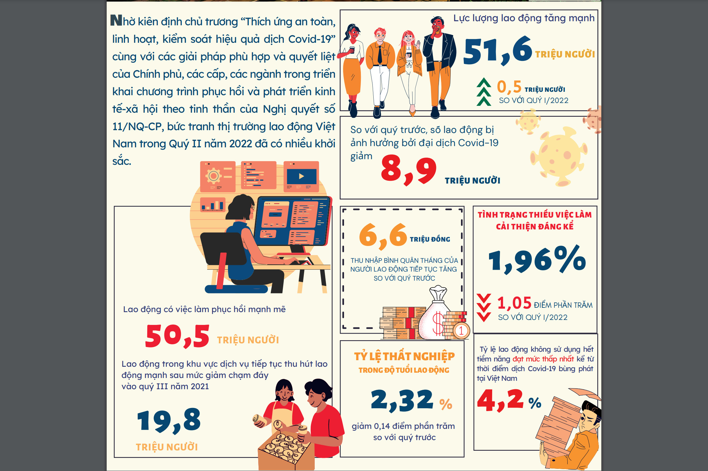 Thị trường lao động phục hồi mạnh mẽ, tăng trưởng mang tính tích cực bền vững hơn với mức tăng tập trung chủ yếu ở lao động có việc làm chính thức. Tỷ lệ thất nghiệp và thiếu việc làm đều giảm, thu nhập của người lao động tiếp tục được cải thiện. Tuy nhiên, trong thời gian tới, thị trường lao động vẫn có thể đối mặt với nhiều khó khăn thách thức do chịu nhiều áp lực tăng giá xăng và một số mặt hàng thiết yếu từ cuộc khủng hoảng Nga – Ukraina.