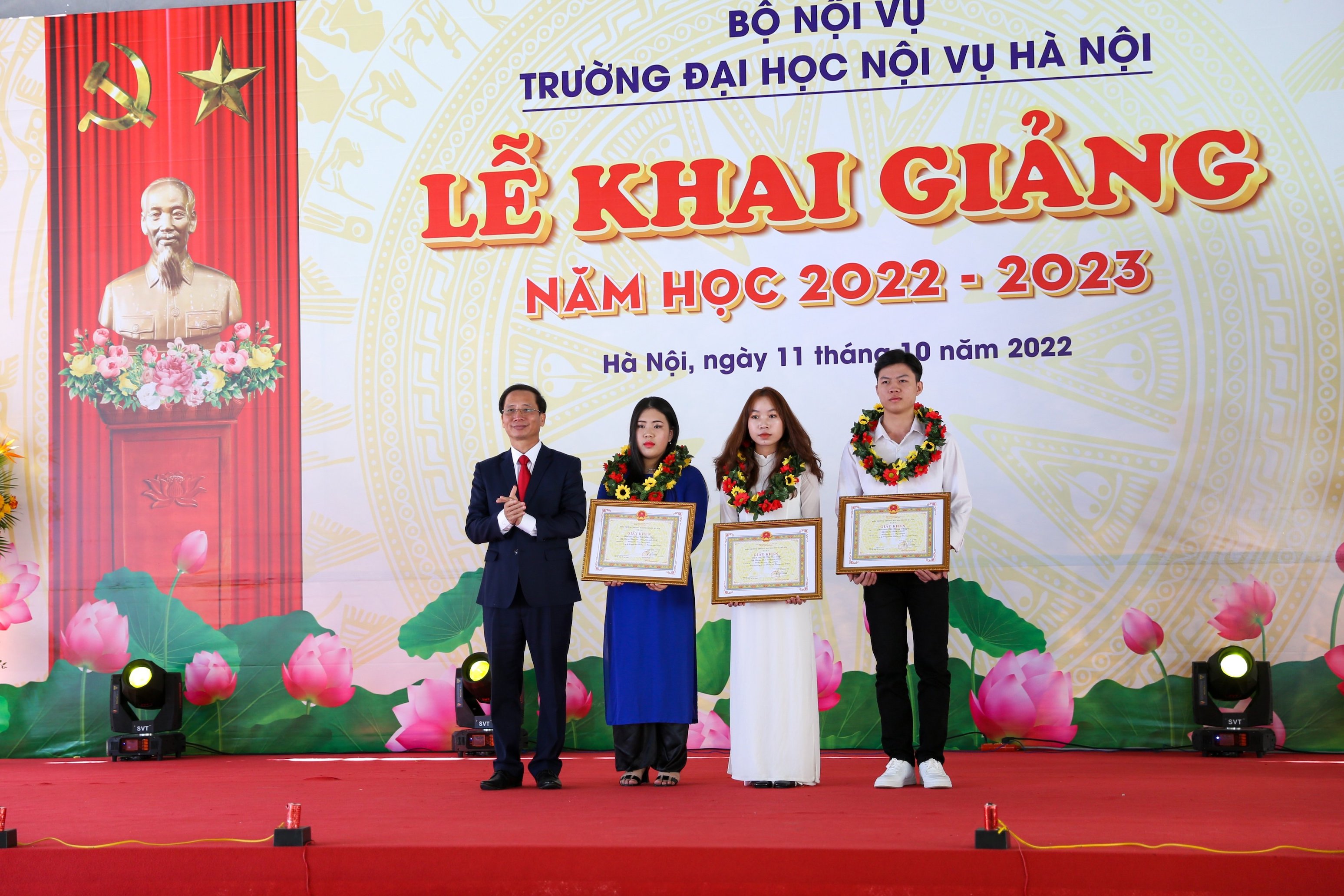 Tại Lễ Khai giảng năm học mới, Ban Giám hiệu Trường Đại học Nội vụ Hà Nội đã tổ chức tuyên dương, khen thưởng các tân thủ khoa đầu vào năm học 2022 – 2023; tuyên dương, khen thưởng các sinh viên có thành tích học tập xuất sắc năm học 2021 – 2022; tuyên dương, khen thưởng các sinh viên tốt nghiệp đạt loại giỏi, xuất sắc.