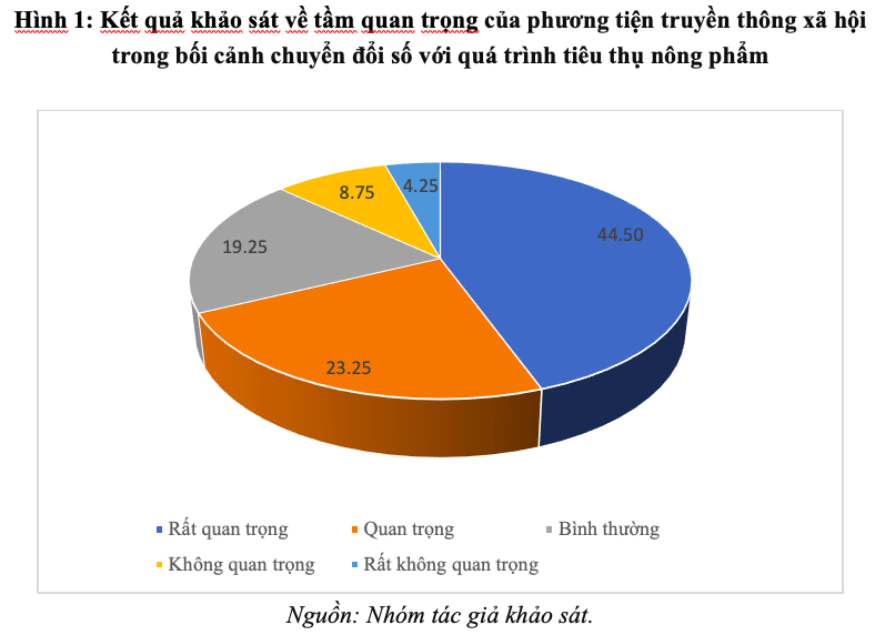 Qua hình 1 cho thấy, các nông dân trẻ tại khu vực Đông Bắc Việt Nam đã có nhận thức tương đối tốt về tầm quan trọng của phương tiện truyền thông xã hội trong bối cảnh chuyển đổi số với quá trình tiêu thụ nông phẩm, có 44,5% ý kiến đánh giá là rất quan trọng, 23,25% ý kiến đánh giá là quan trọng, 19,25% ý kiến đánh giá là bình thường. Khi phỏng vấn sâu nông dân trẻ tại tỉnh Lạng Sơn cho biết: “Bản thân tôi đã sử dụng các công cụ mạng xã hội trong tiêu thụ sản phẩm nông sản do gia đình sản xuất nên nhận thấy nó đã giúp rút ngắn khoảng cách giữa người nông dân hoặc hợp tác xã với người tiêu dùng, loại bỏ nhiều tầng trung gian. Điều này đặc biệt quan trọng trong bối cảnh nông sản dễ bị ép giá hoặc phụ thuộc vào thương lái thu mua nông phẩm”. Tuy nhiên vẫn còn có ý kiến không quan trọng (chiếm 8,75%) và ý kiến rất không quan trọng (chiếm 4,25%).