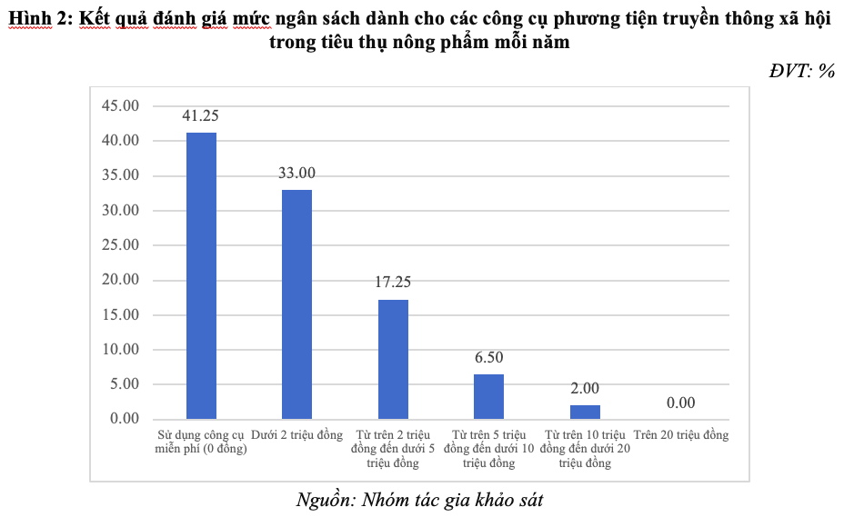 Đa phần nông dân trẻ đang tận dụng các công cụ miễn phí (facebook, zalo,…) chiếm 41,25% cho bài viết, tin gửi,…có 33,0% nông dân chấp nhận trả phí dưới 2 triệu đồng (các Hợp tác xã, doanh nghiệp nông nghiệp trả phí duy trì miền trên website), có 17,25% chấp nhận trả phì tứ 2 đến dưới 5 triệu đồng (các Hợp tác xã, doanh nghiệp nông nghiệp trả phí duy trì miền trên website nhưng thay đổi về tính năng tăng thêm, một số nông dân sử dụng nhiều công cụ phối hợp như vừa email marketing phối hợp website); có 6,5% chấp nhận trả phí từ trên 5 triệu đến dưới 10 triệu đồng (các Hợp tác xã, doanh nghiệp nông nghiệp trả phí duy trì miền trên website nhưng thay đổi về tính năng tăng thêm, cập nhật và bảo mật công nghệ; một số nông dân sử dụng nhiều công cụ phối hợp như vừa email marketing phối hợp website; hoặc liên kết website với sàn TMĐT,…) và chỉ có 2% chấp nhận trả phí từ trên 10 triệu đến dưới 20 triệu đồng (các Hợp tác xã, doanh nghiệp nông nghiệp trả phí duy trì miền trên website nhưng thay đổi về tính năng tăng thêm, cập nhật và bảo mật công nghệ, tích hợp AI/chatbot/phân tích dữ liệu; liên kết website với sàn TMĐT; website tăng nhu cầu về trải nghiệm người dùng (UX/UI) và giao diện đa nền tảng; chi phí cho SEM để lên TOP…). Không có nông dân nào chi trên 20 triệu đồng cho công tác đầu tư phương tiện truyền thông xã hội cho tiêu thụ nông phẩm. Những lý do chính được xác định mức chi phí cho phương tiện truyền thông xã hội trong tiêu thụ nông phẩm bị hạnh chế là do: thiếu niềm tin vào hiệu quả đầu tư; thiếu hiểu biết và kỹ năng về truyền thông xã hội; thu nhập thấp và áp lực tài chính cao; thiếu kế hoạch marketing tổng thể; tâm lý ngại công khai thông tin cá nhân và sản phẩm; thiếu sự hỗ trợ kỹ thuật và mô hình mẫu từ địa phương.