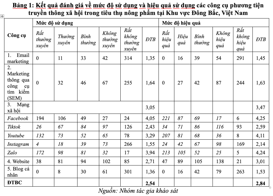 Khi tìm hiểu về mức độ sử dụng và hiệu quả sử dụng các công cụ phương tiện truyền thông xã hội trong tiêu thụ nông phẩm tại Khu vực Đông Bắc, Việt Nam cho thấy, người nông dân trẻ đã có mức độ sử dụng không thường xuyên (ĐTBC: 2,54 điểm) và mức độ hiệu quả sử dụng là bình thường (ĐTBC: 2,84 điểm).