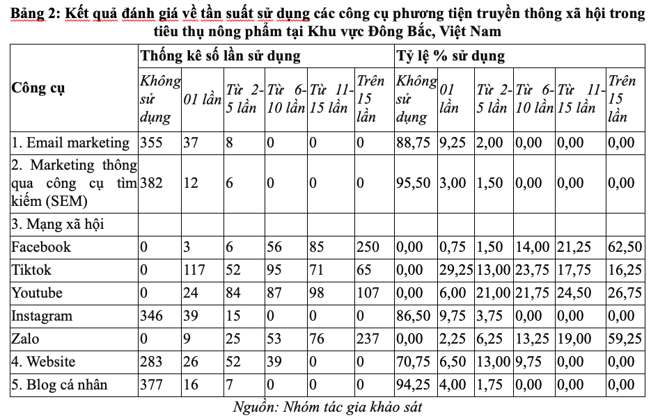 Mặc dù, mỗi công cụ có ưu thế riêng khi nông dân trẻ lựa chọn làm phương tiện truyền thông xã hội trong tiêu thụ nông phẩm cho mình nhưng bước đầu cho thấy người nông dân trẻ đã có sự tìm kiếm, thanh lọc các công cụ để phù hợp với tri thức bản thân, tính ứng dụng mỗi công cụ, khả năng đào tạo, chi phí, chuyển đổi hành vi mua khách hàng. Nhưng nhìn chung là chưa mạnh mẽ. Nông dân trẻ là người có khả năng tiếp cận khoa học công nghệ tốt nhưng năng lực số của họ có hạn chế nhất định nên đa phần đang sử dụng theo thói quen (vì lượng bạn bè trên môi trường số lớn), chi phí thấp (công cụ chưa thu phí như zalo, facebook,…), tính phổ biến, dễ sử dụng và khả năng liên kết dễ dàng (facebook, zalo, tiktok, website,..). Kết quả đánh giá về tần suất sử dụng các công cụ phương tiện truyền thông xã hội trong tiêu thụ nông phẩm tại Khu vực Đông Bắc, Việt Nam thể hiện ở bảng sau: