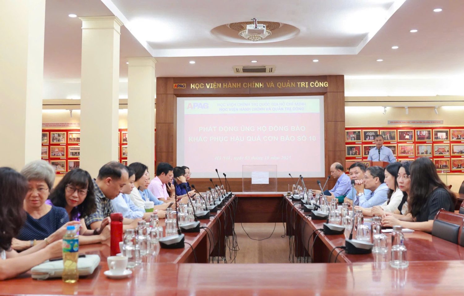 (Quanlynhanuoc.vn) – Phát huy truyền thống “tương thân tương ái”, “lá lành đùm lá rách” của dân tộc Việt Nam, chiều ngày 03/10/2025, tại Hà Nội, Học viện Hành chính và Quản trị công tổ chức Lễ phát động ủng hộ đồng bào khắc phục hậu quả cơn bão số 10 (Bualoi). Hoạt động nhằm lan tỏa những giá trị cao đẹp của dân tộc Việt Nam, thể hiện tinh thần trách nhiệm và sự sẻ chia sâu sắc của toàn thể viên chức, giảng viên, người lao động và học viên, sinh viên Học viện đối với những thiệt hại, mất mát của đồng bào.