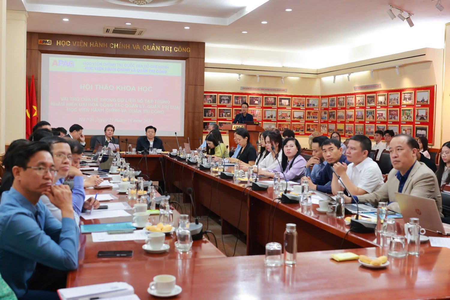 (Quanlynhanuoc.vn) – Sáng ngày 23/10/2025, Trung tâm Thông tin – Thư viện đã tổ chức Hội thảo khoa học với chủ đề: “Vai trò của hệ thống dữ liệu số tập trung nhằm hiện đại hóa công tác quản lý, quản trị tại Học viện Hành chính và Quản trị công”. TS. Hoàng Ngọc Hải, Phó Giám đốc Học viện và TS. Phạm Quang Quyền, Q. Giám đốc Trung tâm Thông tin – Thư viện đồng chủ trì Hội thảo.