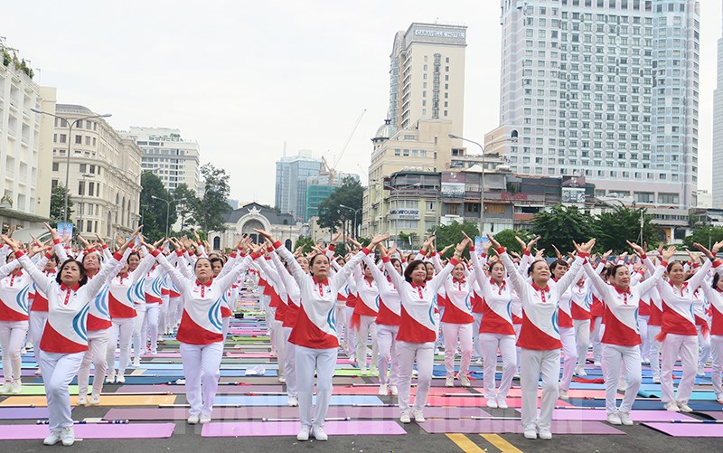 Người cao tuổi đồng diễn thể dục dưỡng sinh.