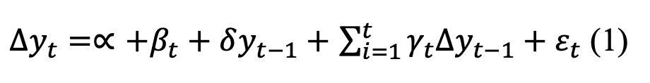 Do dữ liệu vĩ mô thường mang xu hướng tăng theo thời gian, bước đầu tiên của nghiên cứu là kiểm định tính dừng bằng phương pháp Augmented Dickey–Fuller (ADF). Đây là bước quan trọng nhằm tránh nguy cơ nhiễu giả khi mô hình hóa dữ liệu chuỗi thời gian. Dạng tổng quát của kiểm định ADF được biểu diễn trong công thức (1).