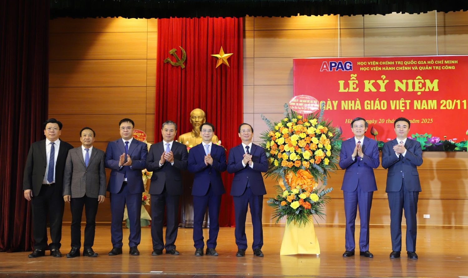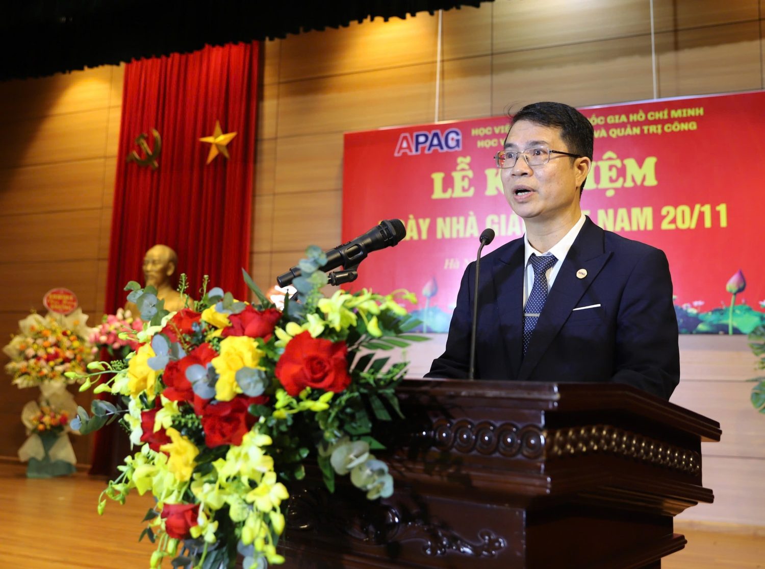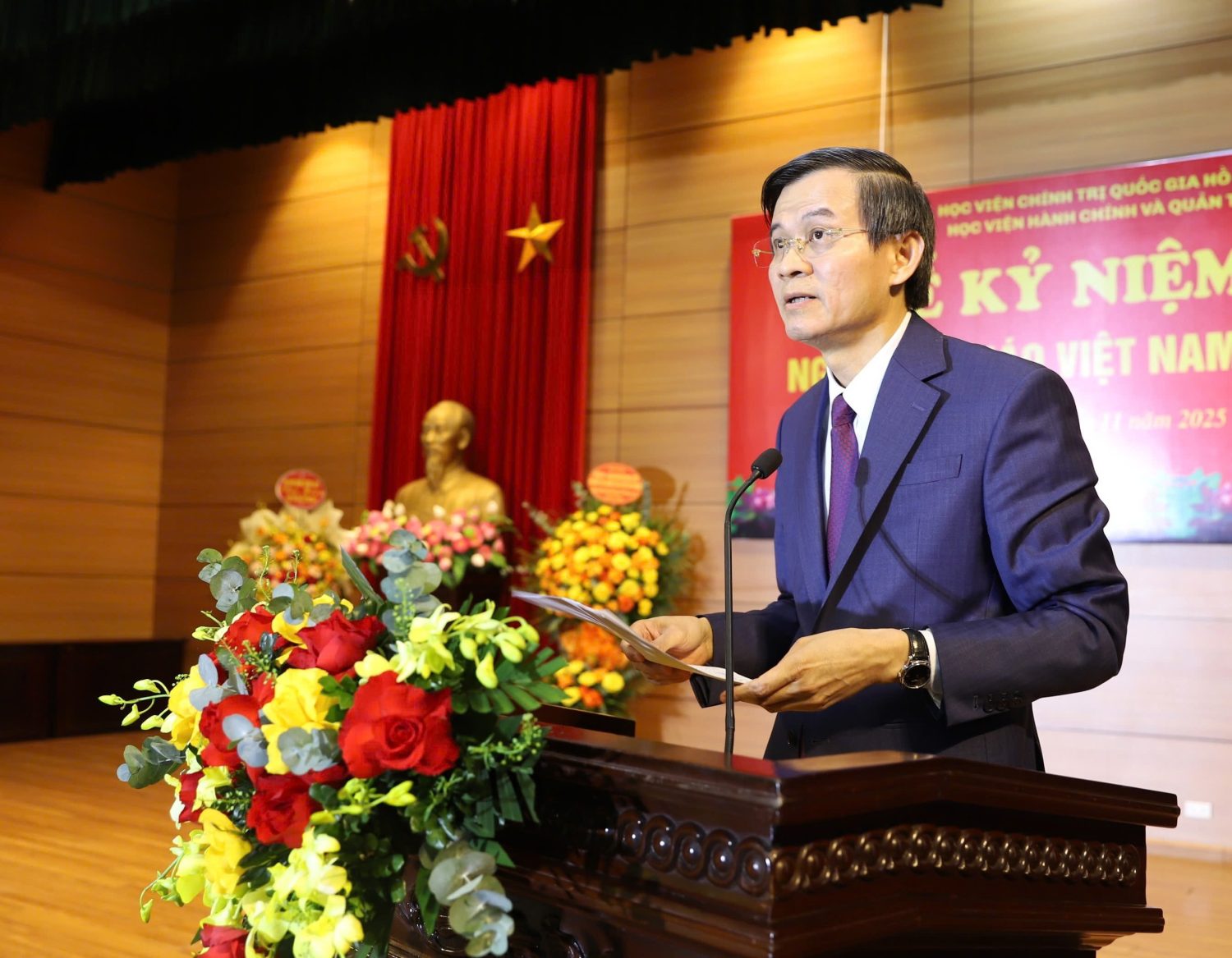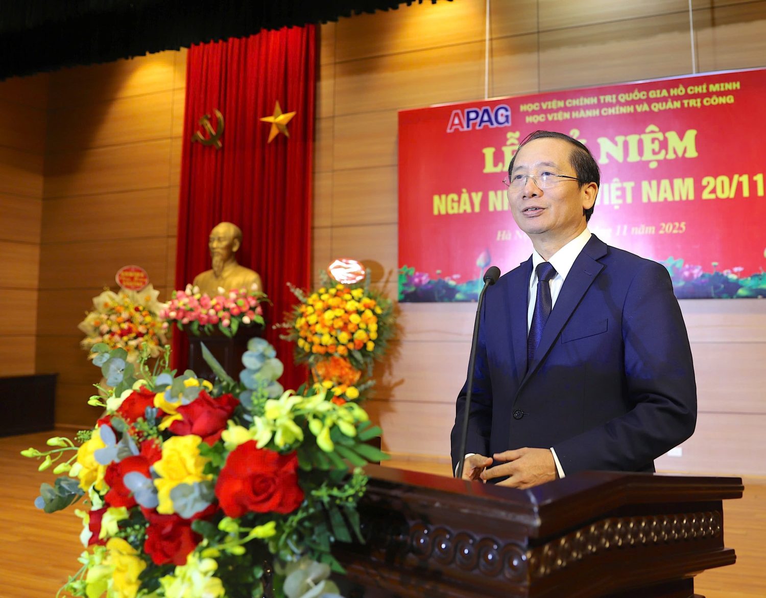 Phát biểu chúc mừng tại Lễ kỷ niệm, PGS.TS Đoàn Minh Huấn, Ủy viên Ban Chấp hành Trung ương Đảng, Phó Bí thư Thường trực Đảng ủy, Phó Giám đốc Thường trực Học viện Chính trị quốc gia Hồ Chí Minh gửi lời chúc mừng tới các thế hệ thầy giáo, cô giáo, viên chức, học viên, sinh viên Học viện Hành chính và Quản trị công; đồng thời, ghi nhận và đánh giá cao những đóng góp to lớn của đội ngũ thầy giáo, cô giáo Học viện Hành chính và Quản trị công đã đạt được. Khẳng định truyền thống “tôn sư trọng đạo” của dân tộc luôn là nền tảng nuôi dưỡng trí tuệ và nhân cách Việt Nam, PGS.TS. Đoàn Minh Huấn nhấn mạnh sứ mệnh thiêng liêng của đội ngũ giảng viên trong hệ thống Học viện: không chỉ truyền đạt tri thức mà còn bồi dưỡng lý tưởng, bản lĩnh chính trị và đạo đức công vụ cho đội ngũ cán bộ phục vụ Nhân dân.