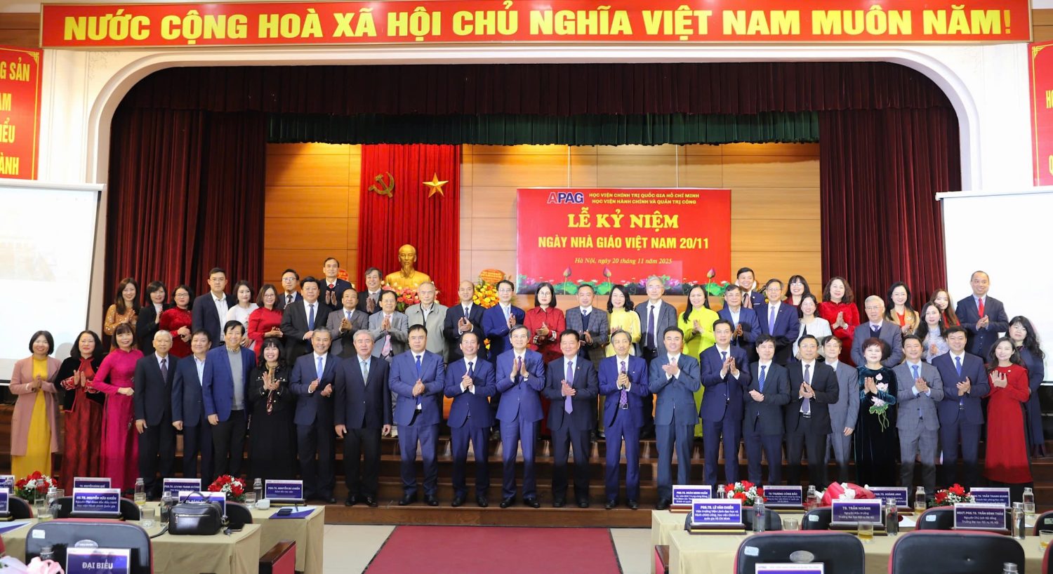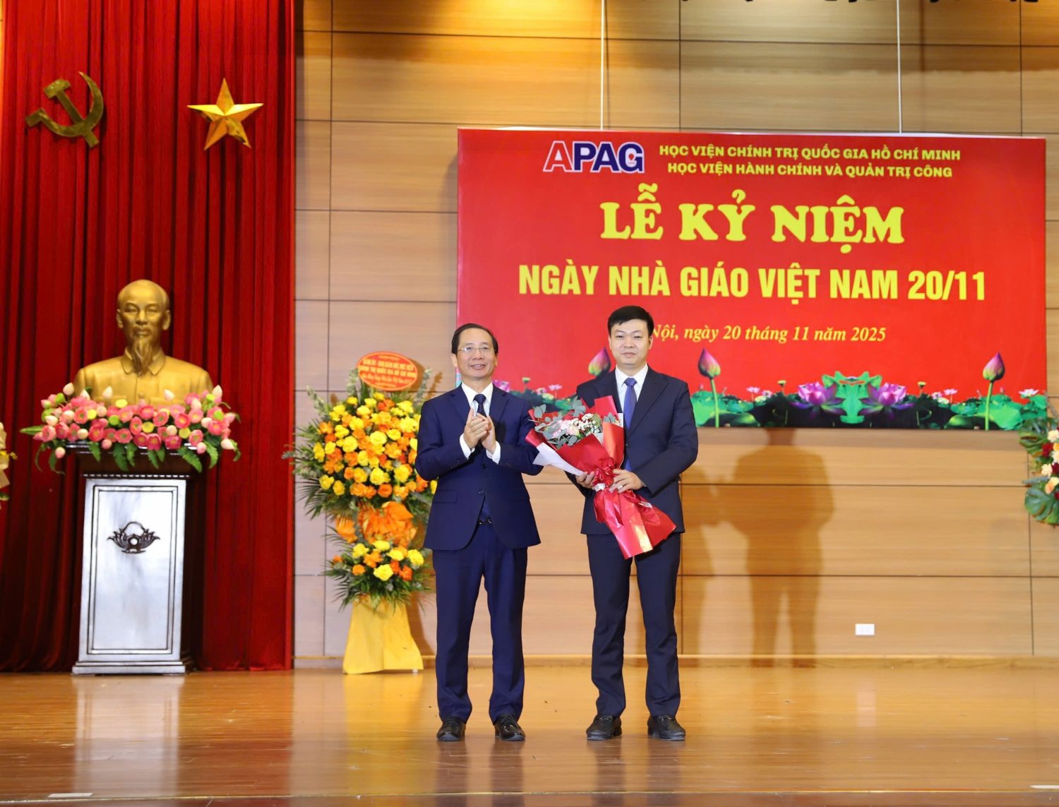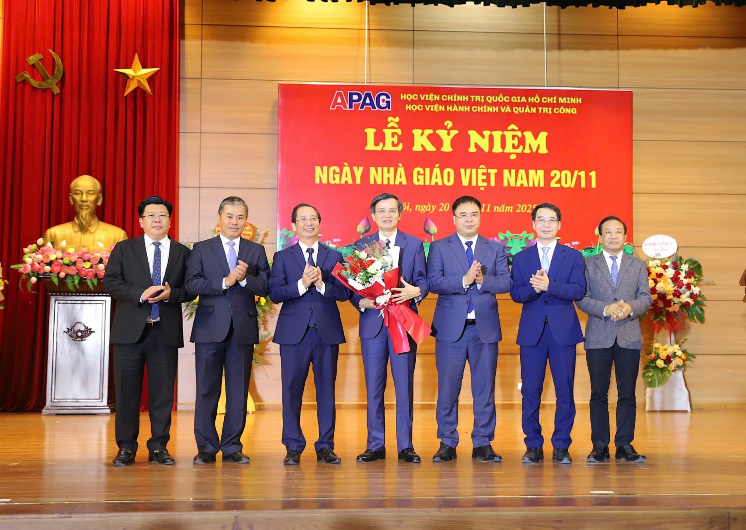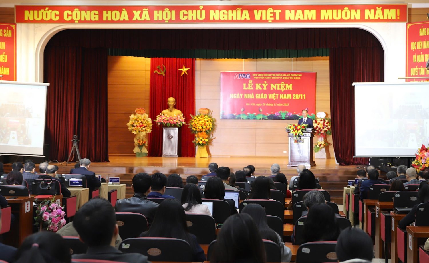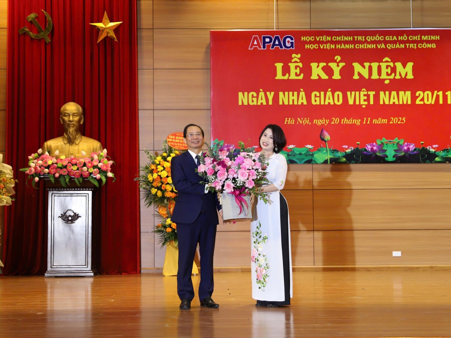 Phát biểu chúc mừng tại Lễ kỷ niệm, PGS.TS Đoàn Minh Huấn, Ủy viên Ban Chấp hành Trung ương Đảng, Phó Bí thư Thường trực Đảng ủy, Phó Giám đốc Thường trực Học viện Chính trị quốc gia Hồ Chí Minh gửi lời chúc mừng tới các thế hệ thầy giáo, cô giáo, viên chức, học viên, sinh viên Học viện Hành chính và Quản trị công; đồng thời, ghi nhận và đánh giá cao những đóng góp to lớn của đội ngũ thầy giáo, cô giáo Học viện Hành chính và Quản trị công đã đạt được. Khẳng định truyền thống “tôn sư trọng đạo” của dân tộc luôn là nền tảng nuôi dưỡng trí tuệ và nhân cách Việt Nam, PGS.TS. Đoàn Minh Huấn nhấn mạnh sứ mệnh thiêng liêng của đội ngũ giảng viên trong hệ thống Học viện: không chỉ truyền đạt tri thức mà còn bồi dưỡng lý tưởng, bản lĩnh chính trị và đạo đức công vụ cho đội ngũ cán bộ phục vụ Nhân dân.