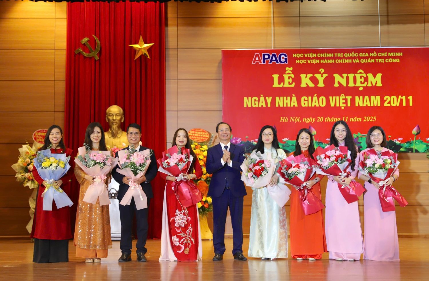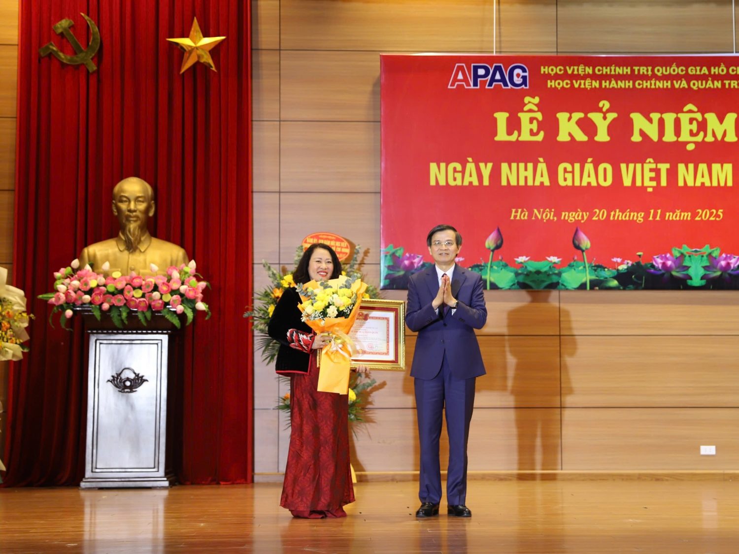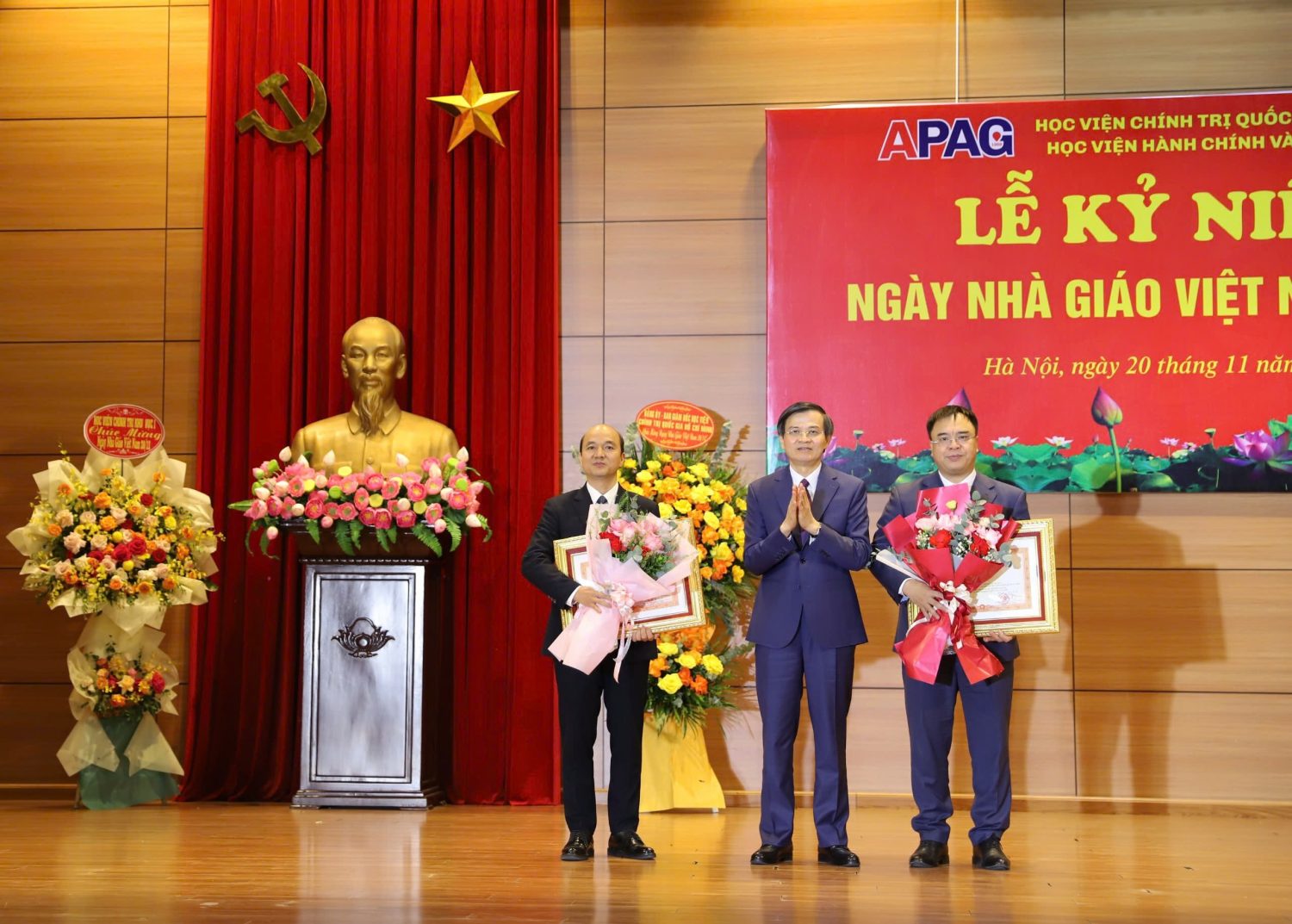 Cũng tại Lễ Kỷ niệm, Học viện đã vinh danh các cá nhân đạt thành tích xuất sắc, gồm: PGS.TS. Trần Thị Diệu Oanh, Trưởng Khoa Luật đạt danh hiệu Chiến sĩ thi đua toàn quốc; GS.TS. Nguyễn Quốc Sửu, Phó Giám đốc Học viện; TS. Nguyễn Huy Hoàng, Trưởng Ban Tổ chức cán bộ nhận Bằng khen của Thủ tướng Chính phủ; TS. Trần Văn Tiến, giảng viên Khoa Quản lý phát triển xã hội, được công nhận chức danh Phó Giáo sư; 3 giảng viên xuất sắc, 5 giảng viên giỏi trong Hội thi Giảng viên giỏi cấp Học viện Chính trị quốc gia Hồ Chí Minh năm 2025.