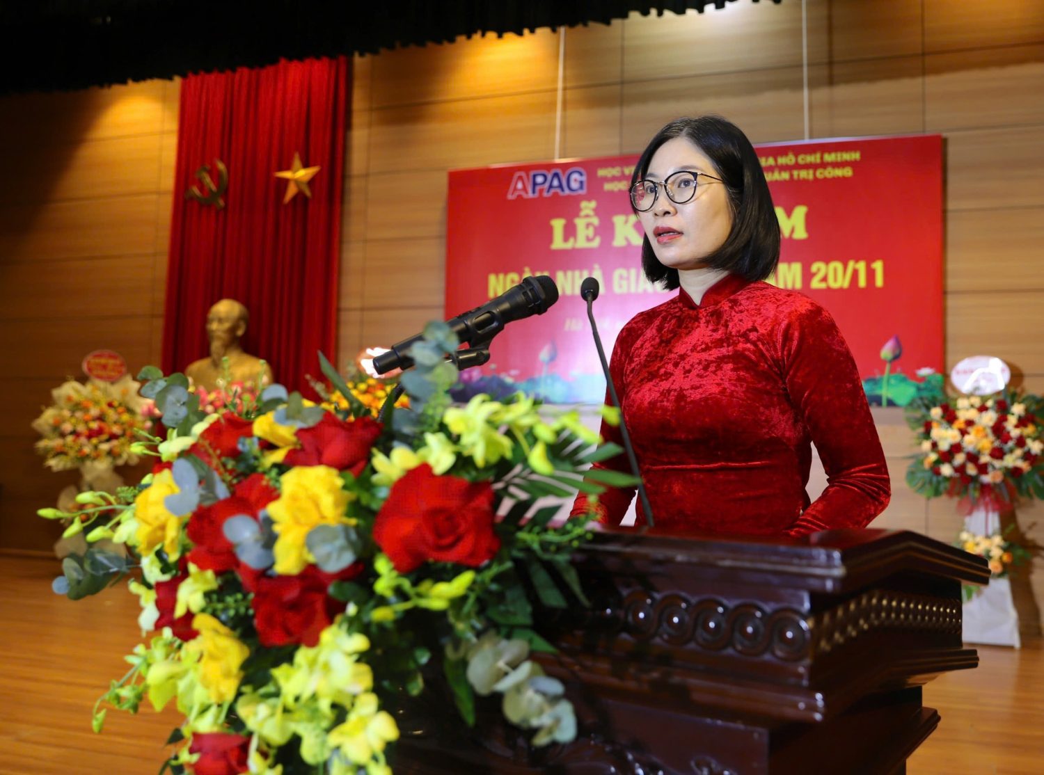 Tại buổi lễ, ThS. Nghiêm Xuân Mừng, Giảng viên Khoa Quản lý phát triển xã hội thay mặt cho đội ngũ giảng viên toàn Học viện, bày tỏ niềm vinh dự và xúc động phát biểu cảm tưởng nhân kỷ niệm Ngày Nhà giáo Việt Nam. ThS. Nghiêm Xuân Mừng nhấn mạnh vai trò, trách nhiệm của nhà giáo trong bối cảnh đổi mới giáo dục, yêu cầu nâng cao chuyên môn, đạo đức và tinh thần cống hiến để góp phần xây dựng Học viện trở thành cơ sở giáo dục trọng điểm, hiện đại, hội nhập quốc tế; đồng thời khẳng định, mỗi nhà giáo cần không ngừng rèn luyện chuyên môn, gìn giữ đạo đức nghề nghiệp và nuôi dưỡng tinh thần cống hiến để cùng chung tay xây dựng Học viện trở thành cơ sở giáo dục trọng điểm, hiện đại và hội nhập quốc tế.