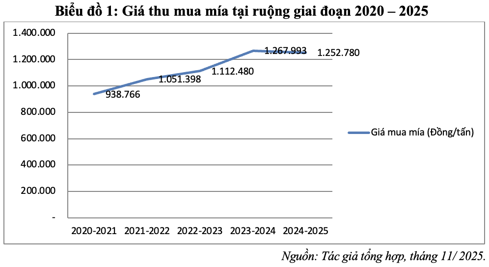 Giá mua mía tại ruộng của các nhà máy mía đường với người trồng tăng ổn định qua các năm: từ 938.766 đồng/tấn giai đoạn 2020 – 2021 lên 1.267.933 đồng/tấn giai đoạn 2023 – 2024. Giai đoạn này giá mua mía tăng khiến cho diện tích trồng mía cũng tăng theo và duy trì nguồn cung nguyên liệu. Tuy nhiên, đến năm 2024 – 2025, giá mía giảm nhẹ xuống còn 1.252.782 đồng/tấn. Sự giảm nhẹ trong giá thu mua mía tại ruộng giai đoạn 2024 – 2025 cảnh báo khả năng biến động của thị trường.