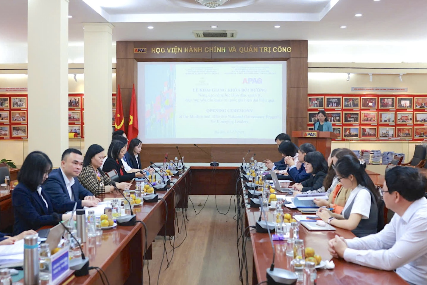 Phát biểu khai mạc, GS.TS. Nguyễn Quốc Sửu, Phó Giám đốc Học viện nhấn mạnh yêu cầu của nền quản trị quốc gia ngày nay không chỉ nằm ở năng lực vận hành bộ máy hay xây dựng thể chế, mà quan trọng hơn là sự đổi mới về tư duy lãnh đạo, cách tiếp cận quản lý và phương thức điều hành. Ông khẳng định, quản trị quốc gia hiện đại đang chuyển dịch mạnh mẽ sang mô hình điều hành dựa trên dữ liệu, công nghệ và bằng chứng chính sách; do đó đội ngũ lãnh đạo, quản lý phải có tư duy đổi mới, tinh thần quyết đoán và thái độ phục vụ Nhân dân. Nền công vụ Việt Nam đang đứng trước những yêu cầu cấp thiết trong cải cách hành chính, xây dựng chính phủ phục vụ, chính phủ số và chính phủ kiến tạo phát triển, khi các cơ quan nhà nước phải chuyển từ “quản lý hành chính” sang “quản trị vì kết quả”. Chính vì vậy, khóa bồi dưỡng này có ý nghĩa đặc biệt thiết thực trong việc chuẩn bị đội ngũ lãnh đạo, quản lý các cấp có bản lĩnh chính trị, có tư duy hệ thống, có khả năng điều hành trong bối cảnh biến động và sẵn sàng đổi mới sáng tạo vì mục tiêu phát triển của đất nước.