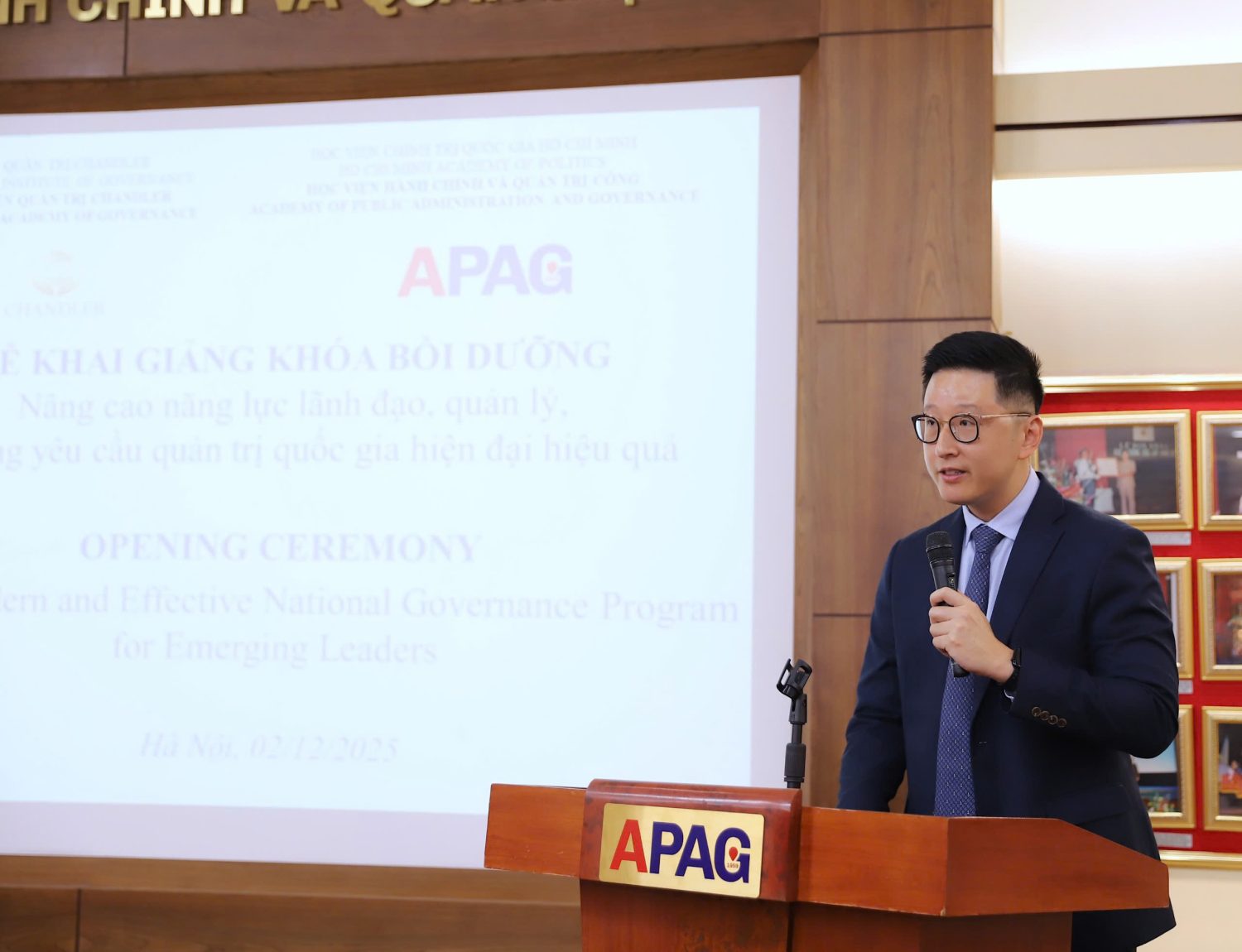 Phát biểu tại buổi lễ, ông Wu Wei Neng, Viện trưởng Viện Quản trị Chandler đánh giá cao nỗ lực hợp tác và triển khai chương trình của Học viện Hành chính và Quản trị công trong suốt thời gian qua. Ông cho rằng một Chính phủ hiệu quả không chỉ đo bằng sự vận hành của bộ máy, mà còn bằng mức độ cải thiện chất lượng dịch vụ công và tác động thực tế đối với đời sống người dân. Từ kinh nghiệm quốc tế, ông nhấn mạnh vai trò của ba trụ cột xây dựng Chính phủ hiệu quả, gồm lãnh đạo hiệu quả, thể chế vững mạnh và văn hóa hướng đến hiệu suất. Ông cũng khẳng định Viện Quản trị Chandler sẽ tiếp tục đồng hành trong việc tài trợ, đồng thiết kế và triển khai chương trình, qua đó hỗ trợ Việt Nam xây dựng đội ngũ lãnh đạo công có tầm nhìn chiến lược và năng lực hành động trong bối cảnh hội nhập và chuyển đổi số.