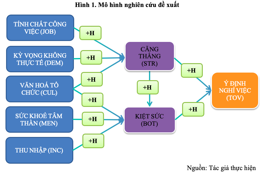 Mô hình nghiên cứu trong đề tài này được xây dựng dựa trên mô hình yêu cầu – nguồn lực công việc (Job Demands–Resources Model – JD-R) do Bakker & Demerouti (2007) đề xuất. Mô hình JD-R cho rằng, các yêu cầu công việc như khối lượng công việc cao, áp lực thời gian và sự mơ hồ trong vai trò có thể dẫn đến căng thẳng và kiệt sức cảm xúc, từ đó làm tăng nguy cơ ý định nghỉ việc. Ngược lại, các nguồn lực công việc như môi trường làm việc tích cực, sự hỗ trợ từ cấp trên, chính sách lương thưởng hợp lý sẽ giúp giảm thiểu các tác động tiêu cực của yêu cầu công việc, đồng thời nâng cao động lực và cam kết tổ chức.