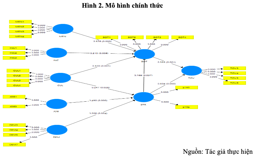 (3) Phân tích mức độ tác động giữa các biến trong mô hình.Kết quả kiểm định mô hình cấu trúc bằng phương pháp PLS-SEM cho thấy cả năm yếu tố được đề xuất trong mô hình đều có ảnh hưởng có ý nghĩa thống kê đến ý định nghỉ việc (TOV) của nhân viên trong lĩnh vực dịch vụ marketing tại TP. Hồ Chí Minh. Cụ thể, các hệ số đường dẫn (β) (Bảng 8) lần lượt như sau: