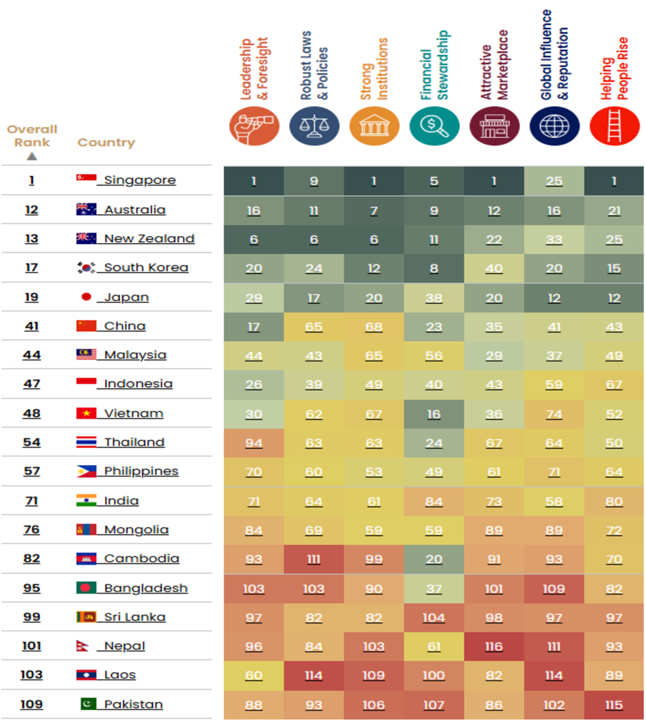 Đối với khu vực châu Á – Thái Bình Dương, nhiều quốc gia tiếp tục thể hiện hiệu quả quản trị mạnh mẽ, với 5 quốc gia nằm trong top 20 toàn cầu, gồm: Singapore, Australia, New Zealand, Hàn Quốc và Nhật Bản. Singapore tiếp tục giữ vị trí dẫn đầu toàn cầu nhờ kết quả vượt trội ở các trụ cột Lãnh đạo và Tầm nhìn, Thể chế mạnh và Thị trường hấp dẫn. Bên cạnh đó, các quốc gia có thu nhập trung bình, như:Trung Quốc, Việt Nam và Mông Cổ cũng ghi nhận sự cải thiện ổn định, cho thấy đầu tư vào năng lực thể chế đang trở thành động lực quan trọng thúc đẩy tăng trưởng và khả năng chống chịu.