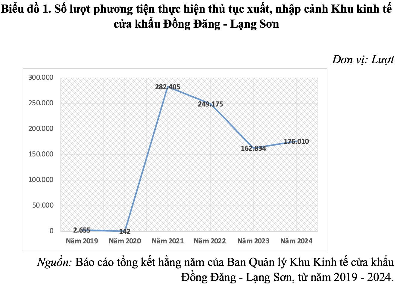 Biểu đồ 1 cho thấy, lưu lượng phương tiện tại khu vực cửa khẩu Đồng Đăng – Lạng Sơn biến động mạnh giai đoạn 2019 – 2024, sụt giảm sâu năm 2020 nhưng phục hồi nhanh và đạt đỉnh vào năm 2021, sau đó, duy trì ở mức cao và ổn định. Diễn biến này phản ánh sự khôi phục mạnh mẽ của hoạt động logistics biên giới; đồng thời cho thấy, áp lực lớn và liên tục đối với hệ thống bến bãi, kho lạnh và đường chuyên dụng. Khi lưu lượng phương tiện duy trì ở mức cao, chỉ một biến động nhỏ về mùa vụ hoặc chính sách cũng có thể nhanh chóng gây quá tải, làm tăng chi phí và rủi ro trong vận hành logistics tại Khu kinh tế cửa khẩu Đồng Đăng – Lạng Sơn.
