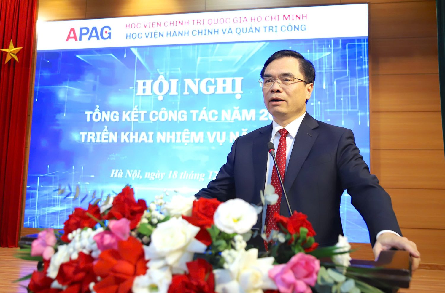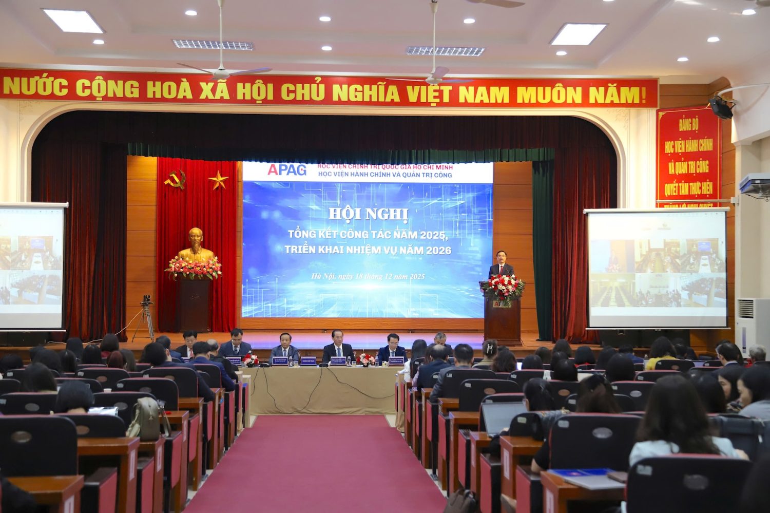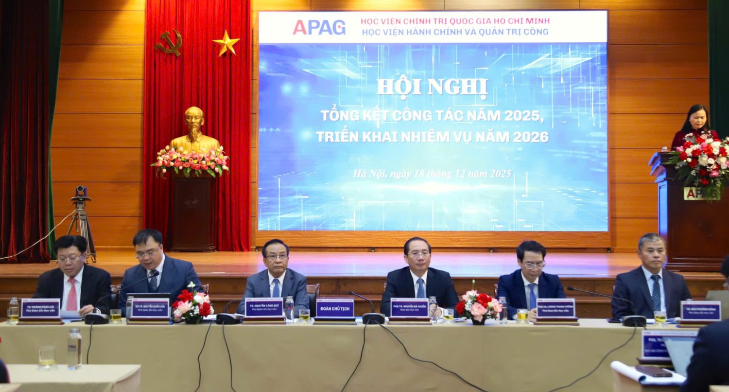 (Quanlynhanuoc.vn) – Sáng ngày 18/12/2025, Học viện Hành chính và Quản trị công đã trang trọng tổ chức Hội nghị Tổng kết công tác năm 2025, triển khai nhiệm vụ năm 2026, kết hợp ba nội dung: Tổng kết công tác Đảng năm 2025, triển khai nhiệm vụ năm 2026; Hội nghị viên chức, người lao động năm 2025; Tổng kết công tác chuyên môn năm 2025, triển khai nhiệm vụ năm 2026. PGS.TS. Dương Trung Ý, Phó Giám đốc Học viện Chính trị quốc gia Hồ Chí Minh dự và phát biểu chỉ đạo Hội nghị.
