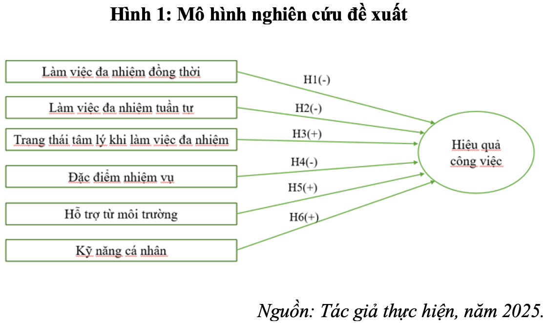 Làm việc đa nhiệm được định nghĩa là khả năng thực hiện nhiều nhiệm vụ đồng thời (xử lý nhiều nhiệm vụ cùng lúc) hoặc tuần tự (luân chuyển giữa các nhiệm vụ), đòi hỏi phân bổ nguồn lực nhận thức, thời gian và năng lượng6. Hiệu quả công việc phản ánh mức độ hoàn thành nhiệm vụ và đóng góp vào mục tiêu tổ chức7 với các tiêu chí đánh giá bao gồm thời gian hoàn thành, chất lượng công việc và mức độ hài lòng của khách hàng hoặc nội bộ8. Các yếu tố ảnh hưởng đến hiệu quả công việc bao gồm điều kiện làm việc, mức lương, trách nhiệm công việc, kỹ năng cá nhân và trạng thái tâm lý9.