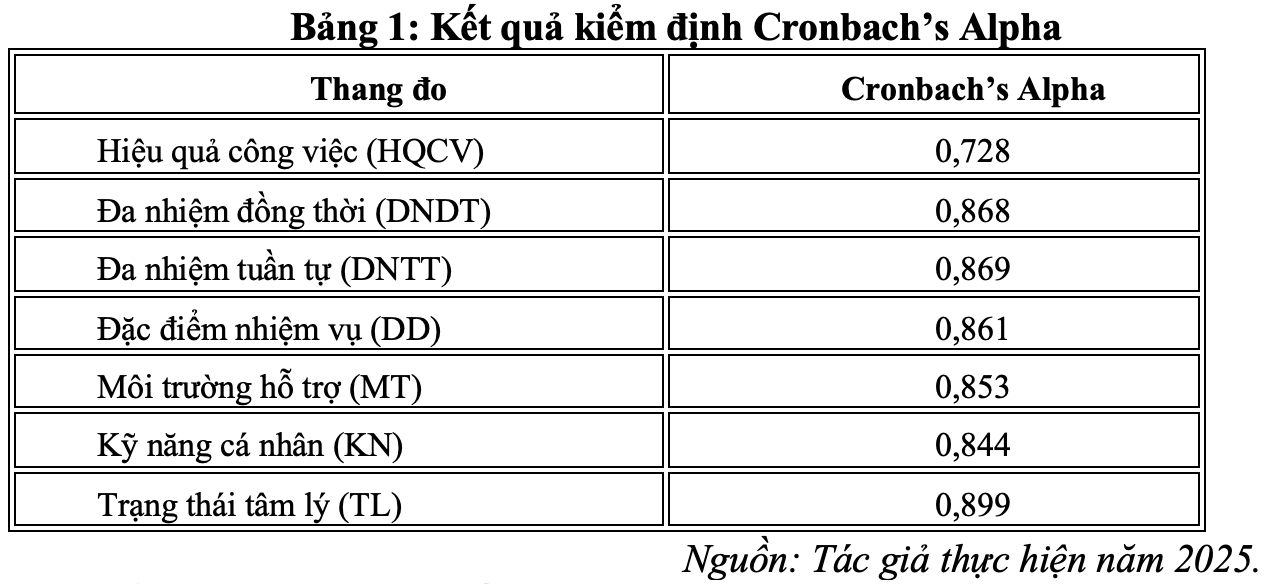 Nghiên cứu tập trung khảo sát tại các doanh nghiệp bán hàng qua sàn thương mại điện tử ở Hà Nội, TP. Hồ Chí Minh và Đà Nẵng, bao gồm các cửa hàng trực tuyến, công ty thương mại sử dụng nền tảng thương mại điện tử (như: Shopee, Lazada, Tiki, TikTok Shop…) để kinh doanh sản phẩm/dịch vụ. Các doanh nghiệp này thường có quy mô vừa và nhỏ, hoạt động chủ yếu trong lĩnh vực bán lẻ và dịch vụ, với đội ngũ nhân sự trẻ, làm việc trong môi trường đa nhiệm cao như chăm sóc khách hàng, xử lý đơn hàng, chạy quảng cáo và phân tích dữ liệu. Một số doanh nghiệp thuộc nhóm nền tảng thương mại điện tử hoặc dịch vụ liên quan (vận chuyển, thanh toán điện tử) cũng được tiếp cận nhằm mở rộng phạm vi nghiên cứu, tuy nhiên chiếm tỷ lệ nhỏ trong tổng mẫu khảo sát. Đối tượng thu thập được xác định là thế hệ Z bằng cách sàng lọc qua câu hỏi nhân khẩu học về năm sinh (1997 – 2012), bảo đảm tất cả người trả lời thuộc nhóm tuổi này. Bảng khảo sát sử dụng thang đo Likert 5 điểm, được thiết kế với 3 nhóm câu hỏi, hiệu chỉnh từ các nghiên cứu của Elias & Scarbrough13 và Rotundo & Sackett14, bao gồm thông tin nhân khẩu học, hành vi làm việc đa nhiệm, và thang đo hiệu quả công việc với 5 khía cạnh: thời gian hoàn thành công việc, chất lượng công việc, sự hài lòng của cấp trên, khả năng phản hồi khách hàng và sự chủ động học hỏi. Dữ liệu được làm sạch, kiểm tra giá trị ngoại lệ và phân tích bằng SPSS, áp dụng các kỹ thuật gồm kiểm định Cronbach’s Alpha để đánh giá độ tin cậy thang đo, phân tích nhân tố khám phá (EFA) để xác định các yếu tố tiềm ẩn trong thang đo và hồi quy tuyến tính đa biến để kiểm định tác động của các biến đến hiệu quả công việc với mức ý nghĩa thống kê 95%.