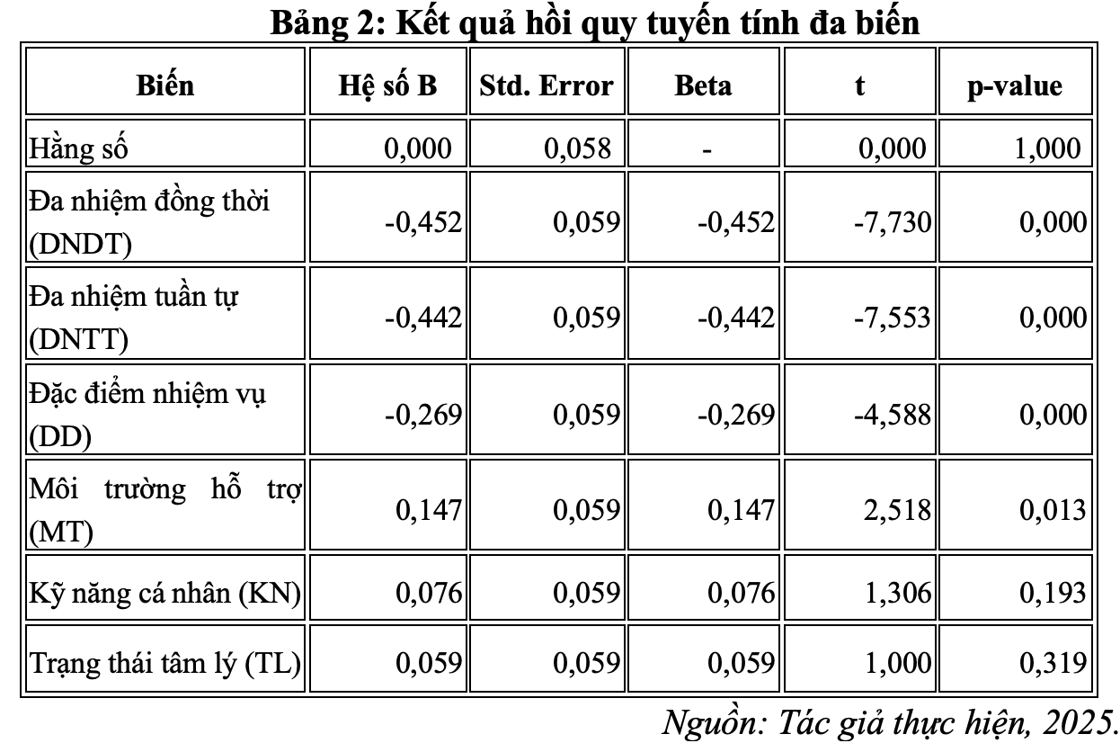 Kết quả nghiên cứu cho thấy cả đa nhiệm đồng thời và tuần tự đều có tác động tiêu cực mạnh đến hiệu quả công việc của Gen Z trong ngành thương mại điện tử. Hệ số β của đa nhiệm đồng thời(-0,452) và đa nhiệm tuần tự (-0,442) cho thấy, việc xử lý nhiều nhiệm vụ cùng lúc hoặc chuyển đổi liên tục giữa các nhiệm vụ làm tăng giao thoa nhận thức, giảm khả năng tập trung và tăng nguy cơ sai sót, như Dzubak16 đã chỉ ra.