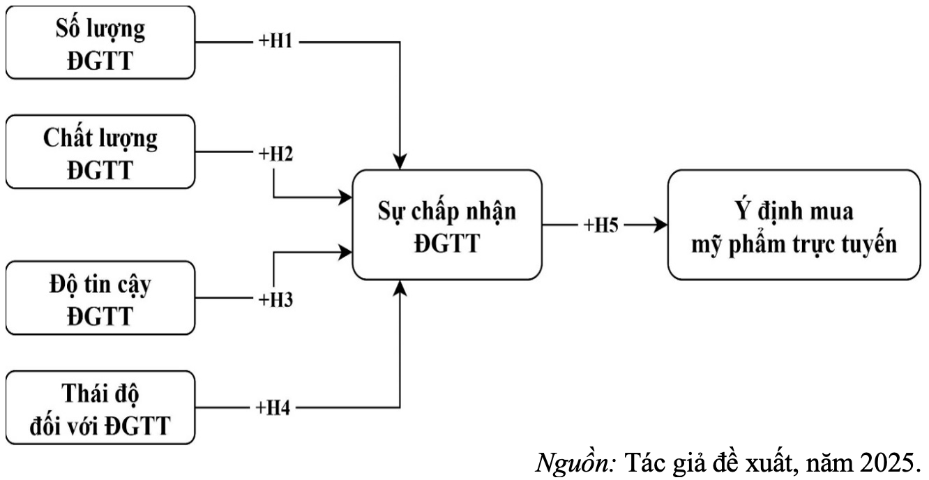 Đánh giá trực tuyến được xem là một dạng thức truyền miệng điện tử (eWOM), trong đó người tiêu dùng chủ động chia sẻ nhận xét, kinh nghiệm và mức độ hài lòng về sản phẩm, dịch vụ trên các sàn thương mại điện tử, mạng xã hội hoặc diễn đàn. Nội dung này thường bao gồm cả thông tin định tính (bình luận, khuyến nghị) và định lượng (xếp hạng, điểm số). Với tính độc lập tương đối so với thông điệp do doanh nghiệp tạo ra, đánh giá trực tuyến trở thành nguồn thông tin quan trọng, giúp người tiêu dùng thuận tiện tìm kiếm thông tin, so sánh lựa chọn, giảm rủi ro về chất lượng và ra quyết định mua hàng tự tin hơn; đồng thời, góp phần hình thành thái độ, ý định mua và hành vi giới thiệu sản phẩm (Nga et al., 2023)4. Nghiên cứu này vận dụng Lý thuyết hành vi có kế hoạch (TPB) của Ajzen (1991) 5 và Mô hình chấp nhận thông tin (IAM) của Sussman & Siegal (2003) 6, trong đó sự chấp nhận thông tin giữ vai trò then chốt trong việc dự báo ý định hành vi. Trên cơ sở kế thừa và tổng hợp kết quả từ các nghiên cứu trước, mô hình nghiên cứu đề xuất gồm năm yếu tố chính.