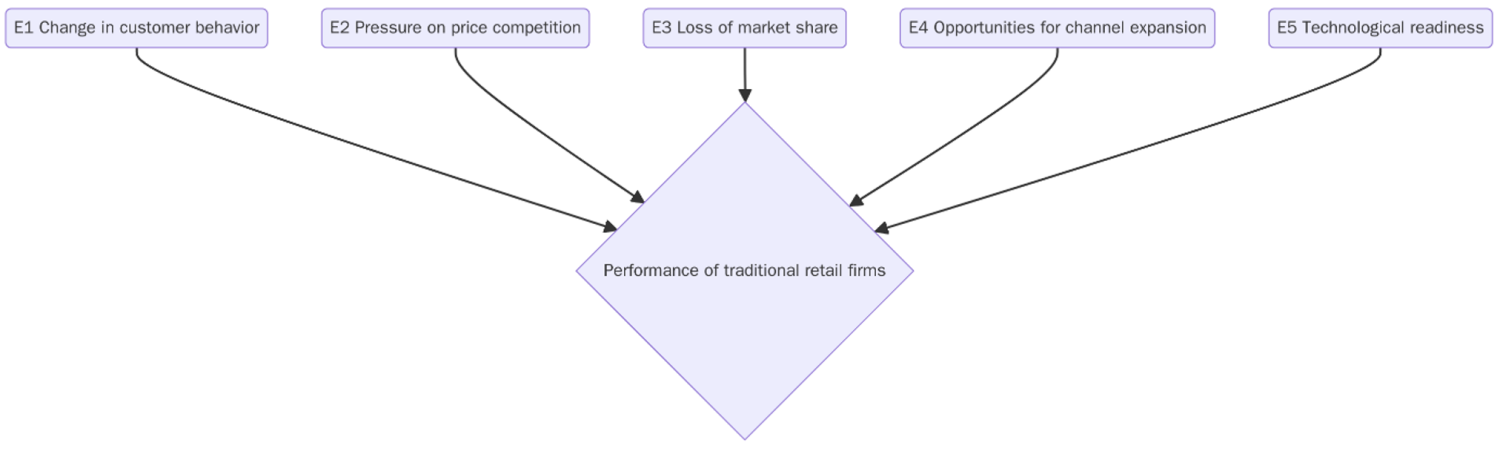 | E2 | Áp lực cạnh tranh về giá | Thương mại điện tử tạo ra môi trường minh bạch giá khiến cửa hàng truyền thống bị ép giảm biên lợi nhuận |