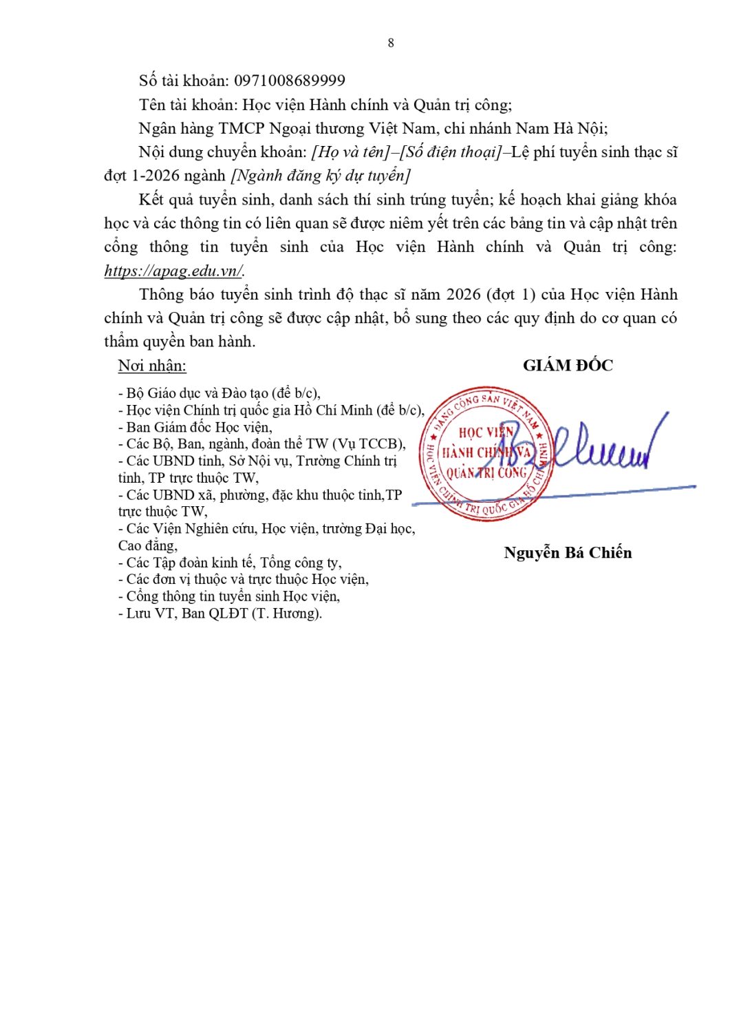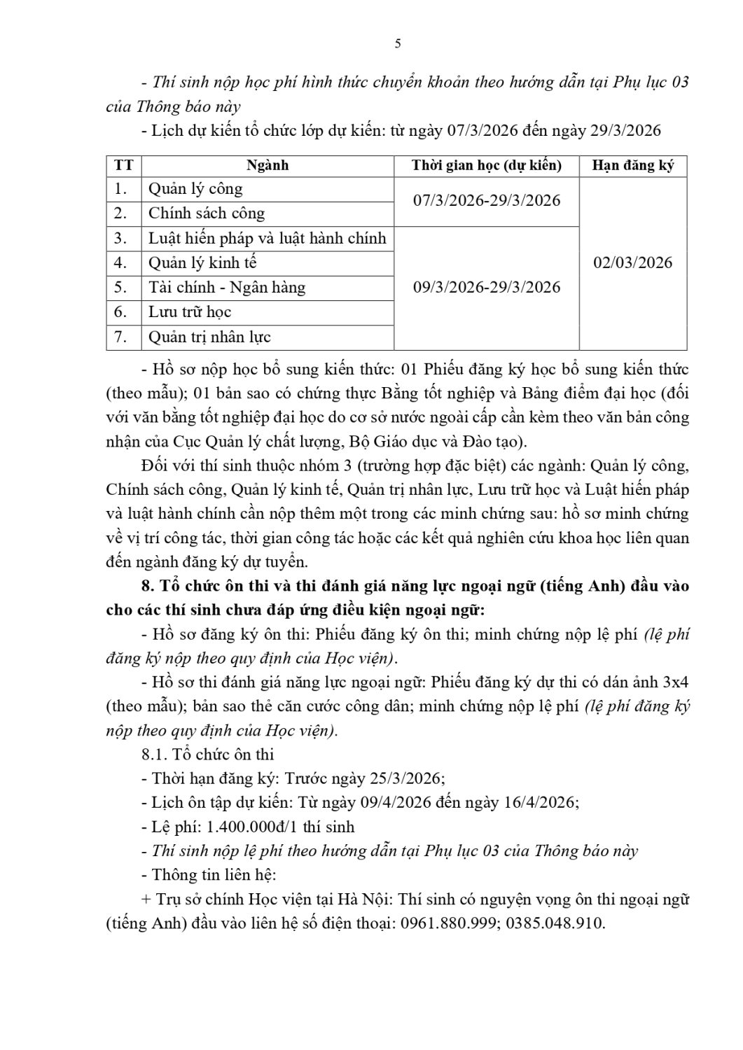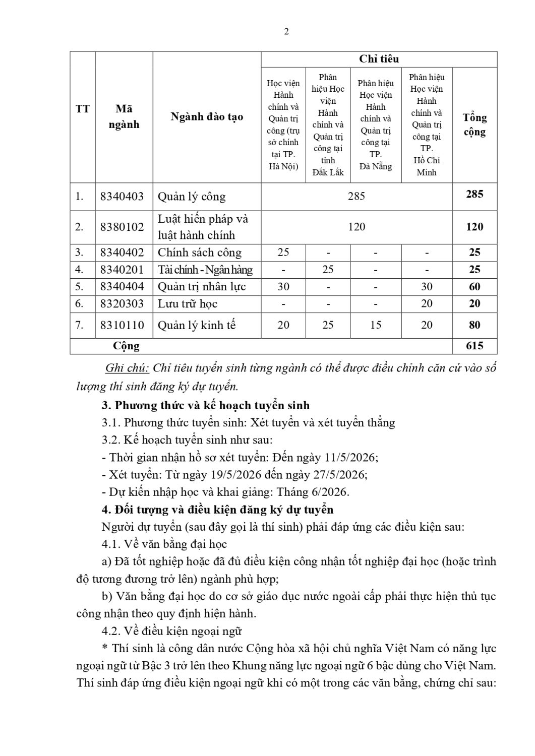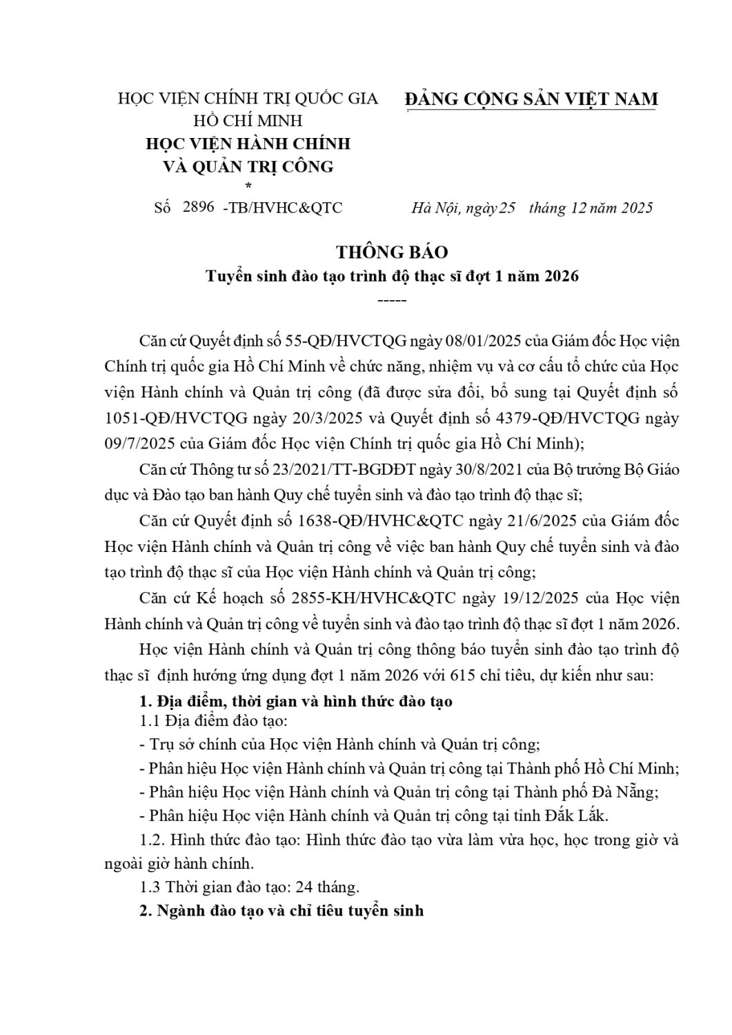 (Quanlynhanuoc.vn) – Học viện Hành chính và Quản trị công ban hành Thông báo số 2896-TB/HVHC&QTC ngày 25/12/2025 tuyển sinh đào tạo trình độ thạc sĩ đợt 1 năm 2026, chỉ tiêu 615 học viên ở 7 ngành: Quản lý công, Luật Hiến pháp và luật hành chính, Chính sách công, Tài chính – Ngân hàng, Quản trị nhân lực, Lưu trữ học, Quản lý kinh tế