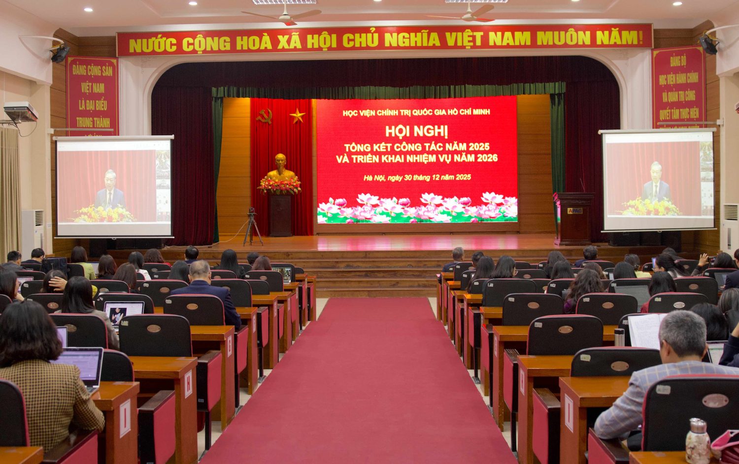Trình bày tóm tắt Báo cáo tổng kết công tác năm 2025, phương hướng, nhiệm vụ năm 2026 tại Hội nghị, PGS.TS. Đoàn Minh Huấn, Ủy viên Ban Chấp hành Trung ương Đảng, Phó Giám đốc thường trực Học viện Chính trị quốc gia Hồ Chí Minh cho biết, năm 2025 là một năm rất đặc biệt trong bối cảnh môi trường chiến lược có nhiều thay đổi, là năm tổ chức đại hội đảng bộ các cấp và chuẩn bị Đại hội Đảng toàn quốc lần thứ XIV của Đảng, là năm Đảng ta đề ra và triển khai những đột phá chiến lược mang tính cách mạng, nhất là sắp xếp đơn vị hành chính, tinh gọn tổ chức bộ máy, định hình cấu trúc mới của hệ thống chính trị và mô hình tổ chức chính quyền địa phương hai cấp. Sự thay đổi môi trường chiến lược vừa đặt ra yêu cầu cao hơn đối với công tác nghiên cứu lý luận và đào tạo cán bộ, vừa tạo động lực thúc đẩy Học viện cơ cấu lại tổ chức và đổi mới các mặt hoạt động, qua đó nâng cao vị thế, làm tròn vai trò, sứ mệnh của mình trong kỷ nguyên phát triển mới.