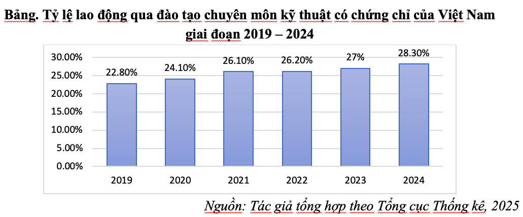 Những năm gần đây, cùng với tiến trình chuyển đổi mô hình tăng trưởng và định hướng phát triển kinh tế tri thức, Việt Nam đã đạt được một số kết quả đáng ghi nhận trong phát triển nguồn nhân lực chất lượng cao trong lĩnh vực khoa học – công nghệ và đổi mới sáng tạo. Theo số liệu của Cục Thống kê, tỷ lệ lao động qua đào tạo chuyên môn kỹ thuật có chứng chỉ của Việt Nam tăng mạnh từ năm 2019 đến nay.