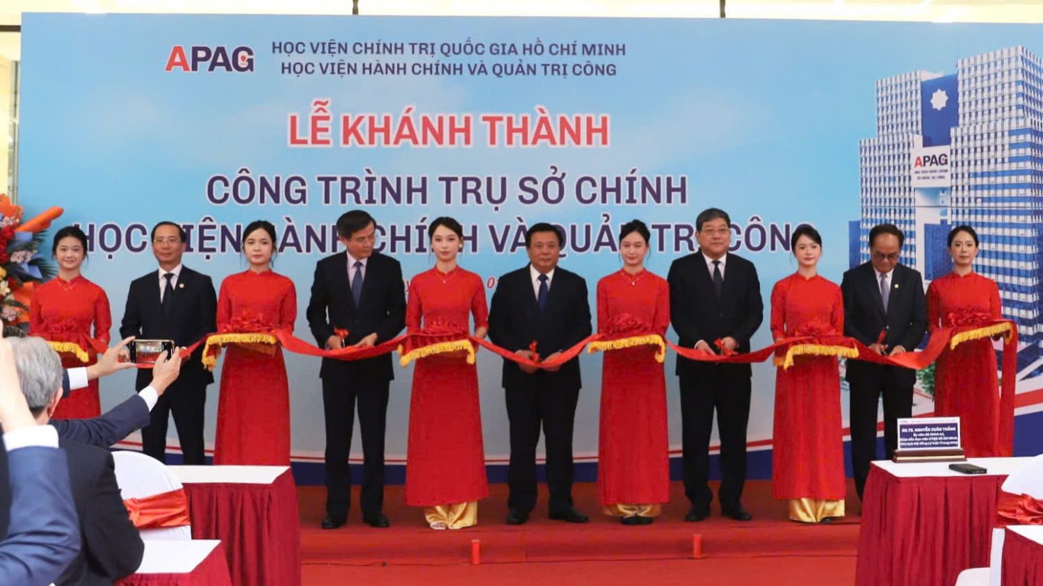 Tại buổi lễ, GS.TS. Nguyễn Xuân Thắng cùng các đại biểu thực hiện nghi thức cắt băng khánh thành và gắn biển công trình “Chào mừng Đại hội đại biểu toàn quốc lần thứ XIV của Đảng Cộng sản Việt Nam”. Đây là sự kiện có ý nghĩa quan trọng, thể hiện quyết tâm của Học viện Hành chính và Quản trị công trong việc cụ thể hóa chủ trương của Đảng về xây dựng đội ngũ cán bộ hành chính, quản trị công chất lượng cao, đáp ứng yêu cầu phát triển đất nước trong giai đoạn mới.