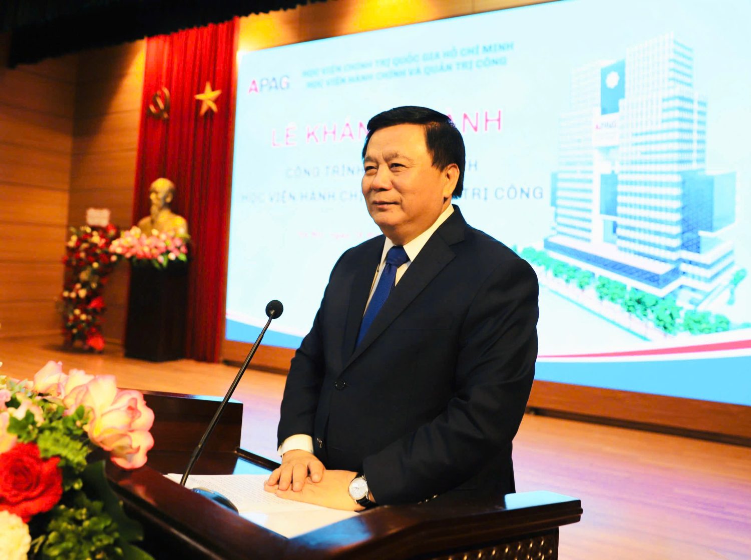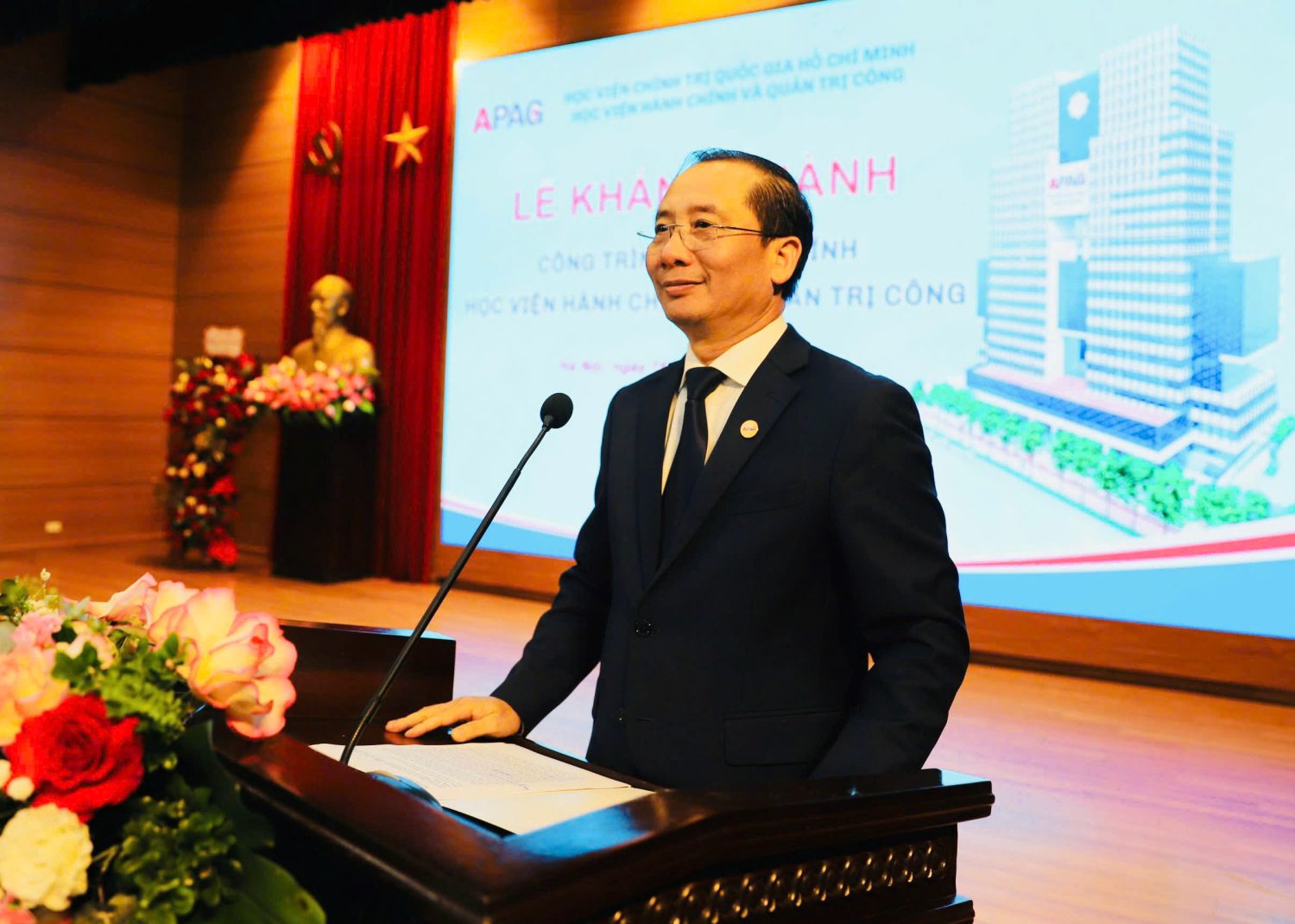 Tại buổi lễ, GS.TS. Nguyễn Xuân Thắng, Ủy viên Bộ Chính trị, Giám đốc Học viện Chính trị quốc gia Hồ Chí Minh, Chủ tịch Hội đồng Lý luận Trung ương nhiệt liệt chúc mừng tập thể lãnh đạo, cán bộ, giảng viên, viên chức và học viên Học viện; khẳng định công trình được xây dựng và hoàn thành đúng dịp chào mừng Đại hội đại biểu toàn quốc lần thứ XIV của Đảng có một ý nghĩa chính trị rất đặc biệt. Đây sẽ là dấu mốc quan trọng, mở đầu cho chặng đường phát triển mới trong tiến trình hiện đại hóa, chuẩn hóa và hội nhập quốc tế, gắn với sứ mệnh đào tạo đội ngũ cán bộ, công chức, viên chức đáp ứng yêu cầu xây dựng nền hành chính và quản trị quốc gia hiện đại. Đồng chí gửi lời cảm ơn sâu sắc tới Bộ Nội vụ đã luôn quan tâm và có tầm nhìn chiến lược trong việc hiện đại hóa cơ sở vật chất cho Học viện, tạo nền tảng quan trọng để nâng cao chất lượng đào tạo, bồi dưỡng cán bộ, công chức, viên chức cho đất nước.