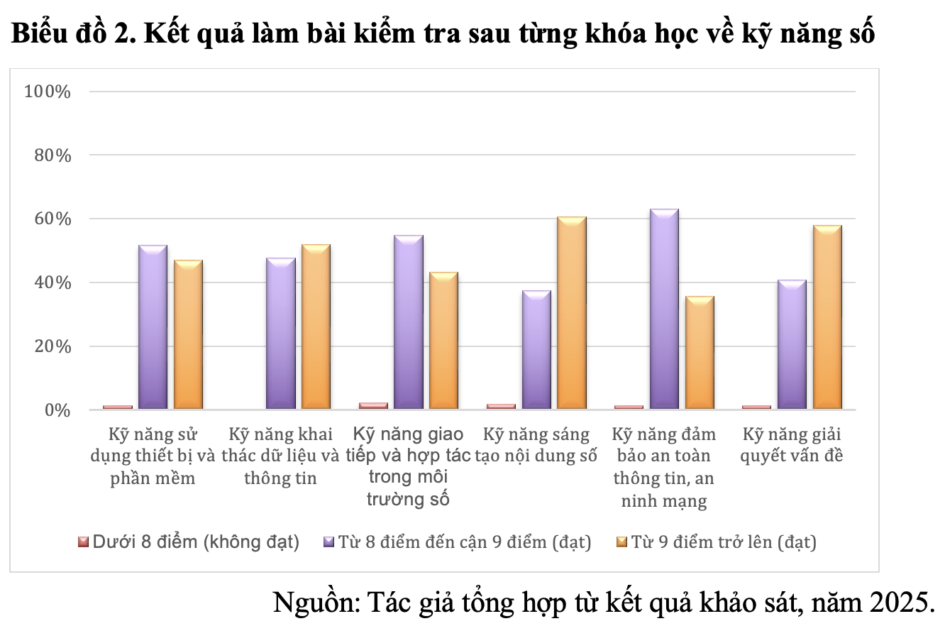 Thông qua khảo sát kết quả kiểm tra các khóa học về kiến thức số cơ bản trong phong trào “bình dân học vụ số”, đa số học viên đều hoàn thành bài kiểm tra trong lần thực hiện đầu tiên. Có hơn 61,7% học viên đạt từ 8 điểm đến cận 9 điểm và có 37,5% học viên đạt từ 9 điểm trở lên ở mỗi bài kiểm tra đối với từng khóa học về kiến thức số. Thông qua kết quả cho thấy, đa số các học viên đã hiểu rõ tầm quan trọng của việc học tập kiến thức số, từ đó, kiên trì, chủ động, tự giác trong quá trình học tập các khóa học.