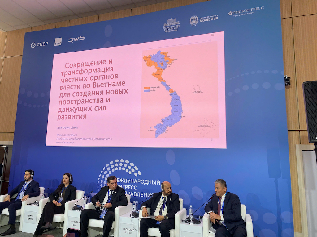Tại phiên thảo luận về kinh nghiệm quốc tế phát triển hệ thống quản lý nhà nước, TS. Bùi Phương Đình – Phó Giám đốc Học viện Hành chính và Quản trị công, Học viện Chính trị Quốc gia Hồ Chí Minh thảo luận chủ đề “Cải cách và chuyển đổi bộ máy chính quyền địa phương ở Việt Nam để tạo không gian và động lực phát triển mới”. Bài tham luận chia sẻ những bài học và định hướng từ thực tiễn cải cách thể chế, tinh gọn bộ máy nhà nước tại trung ương và sắp xếp lại hệ thống chính quyền địa phương hai cấp tại Việt Nam trong năm 2024 – 2045 đã thu hút sự quan tâm và thảo luận sôi nổi của các đại biểu quốc tế.