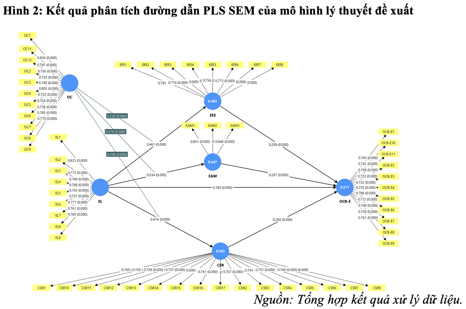 Kết quả kiểm định giả thuyết nghiên cứu (Bảng 1 và Hình 2) cho biết với mức ý nghĩa 5% các hệ số đường dẫn liên quan đến tác động của EL đến EEE, EAM, CSR và OCB-E và tác động trung gian thông qua các cơ chế: EEE, EAM và CSR là có ý nghĩa, tác động trực tiếp của EL đến OCB-E cũng được thống kê là có ý nghĩa, đồng thời cũng xác nhận vai trò điều tiết của OC trong mối quan hệ giữa EL với ba cơ chế này. Cả 13 giả thuyết đều được chấp nhận.