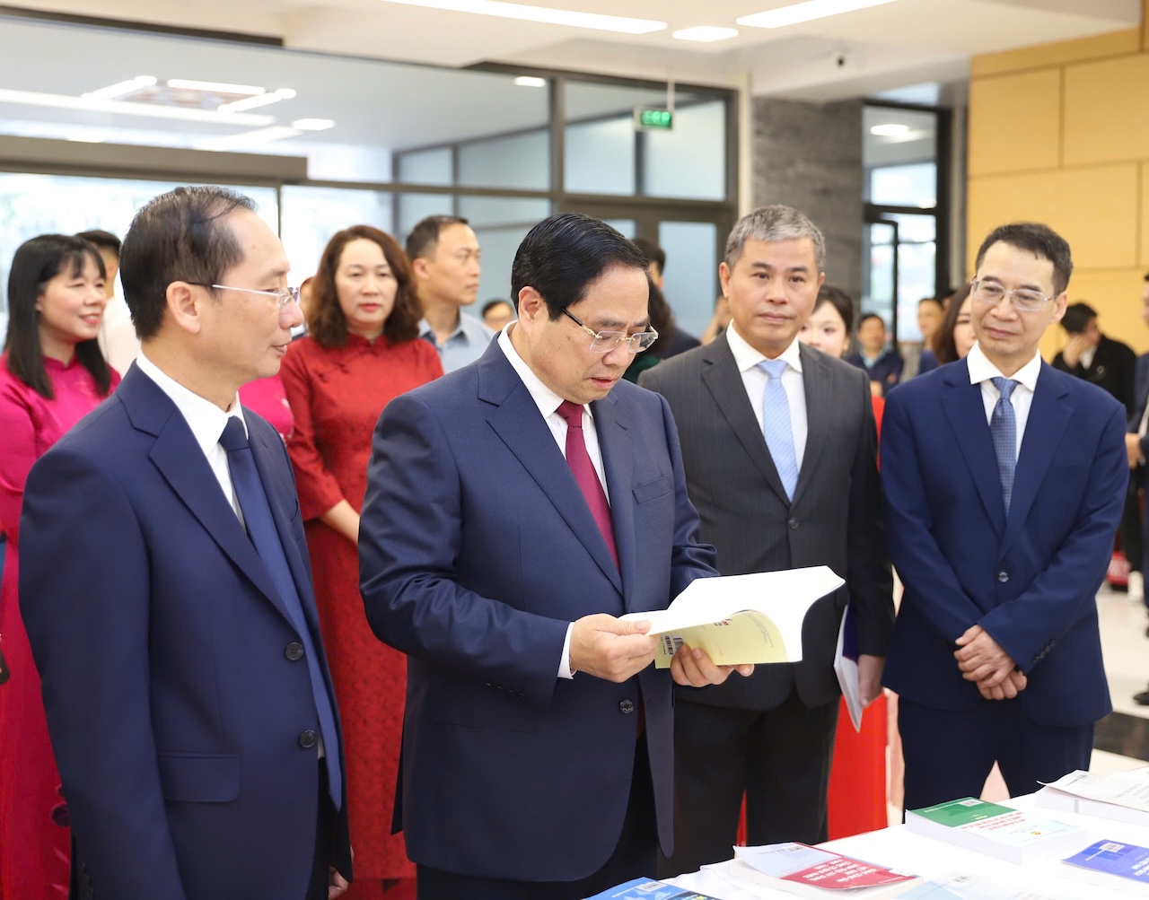 Thủ tướng Chính phủ Phạm Minh Chính cùng các đại biểu tham quan khu trưng bày sách và giới thiệu về các hoạt động của Học viện