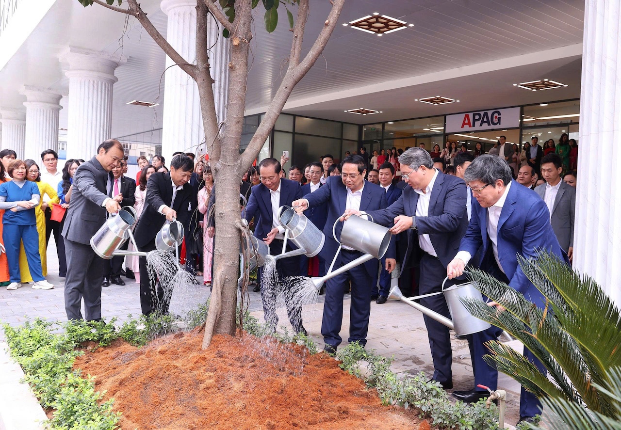 Nhân dịp này, Thủ tướng và Đoàn công tác trồng cây lưu niệm trong khuôn viên Học viện với mong muốn xây dựng môi trường giáo dục xanh, sạch, đẹp, phát triển bền vững; đồng thời, gửi gắm thông điệp về tinh thần đổi mới, vun trồng tri thức và phát triển lâu dài của Học viện trong kỷ nguyên mới.