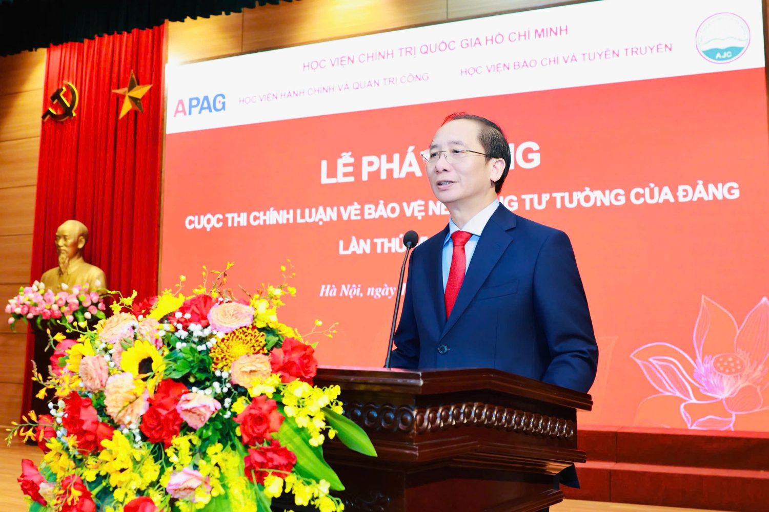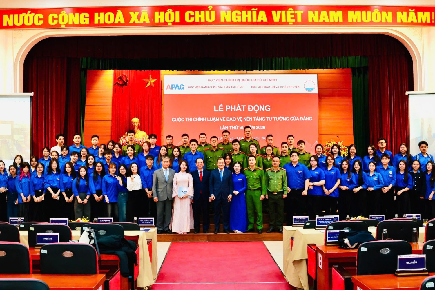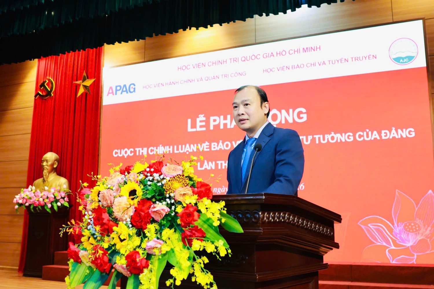 Mượn câu hát “Nhà tôi có treo một lá cờ/Làng tôi có mấy trăm ngọn cờ/Việt Nam có trăm triệu lá cờ/Và tôi chính là một ngọn cờ”, Phó Giám đốc Thường trực Học viện Chính trị quốc gia Hồ Chí Minh hy vọng mỗi thầy cô, đặc biệt là mỗi học viên, mỗi sinh viên, những chủ nhân tương lai của đất nước, hãy “phất cao ngọn cờ” của chính mình trong cuộc thi chính luận bảo vệ nền tảng tư tưởng của Đảng năm 2026, đóng góp xứng đáng vào công cuộc xây dựng chỉnh đốn Đảng, bảo vệ vững chắc trận địa tư tưởng của Đảng trong kỷ nguyên mới – kỷ nguyên vươn mình của dân tộc Việt Nam.
