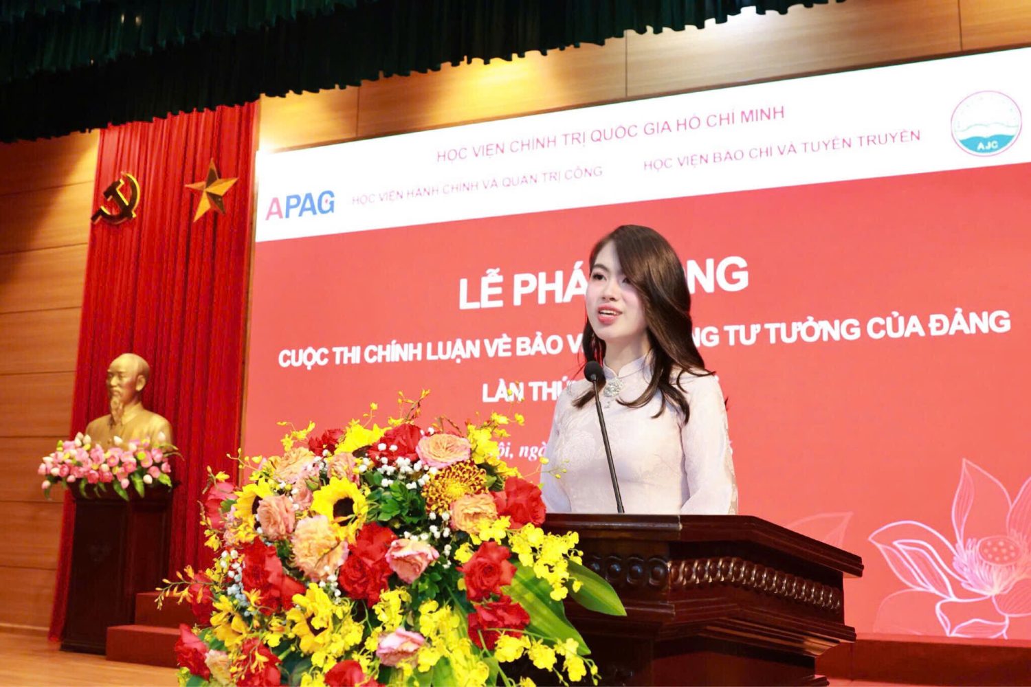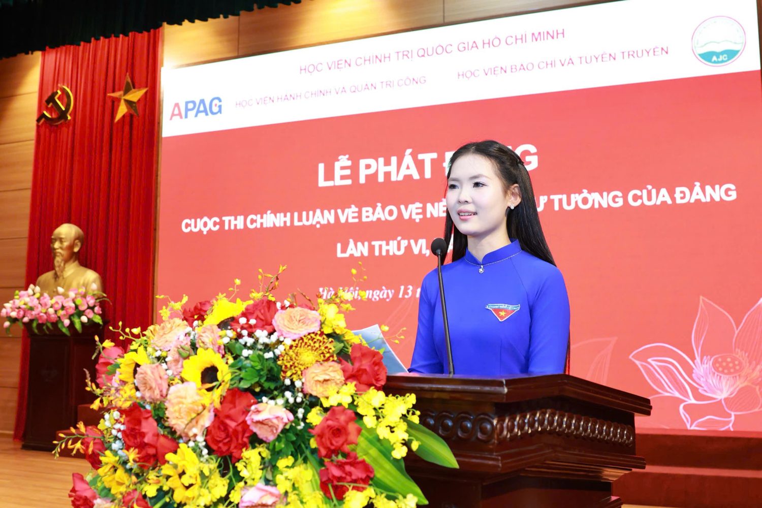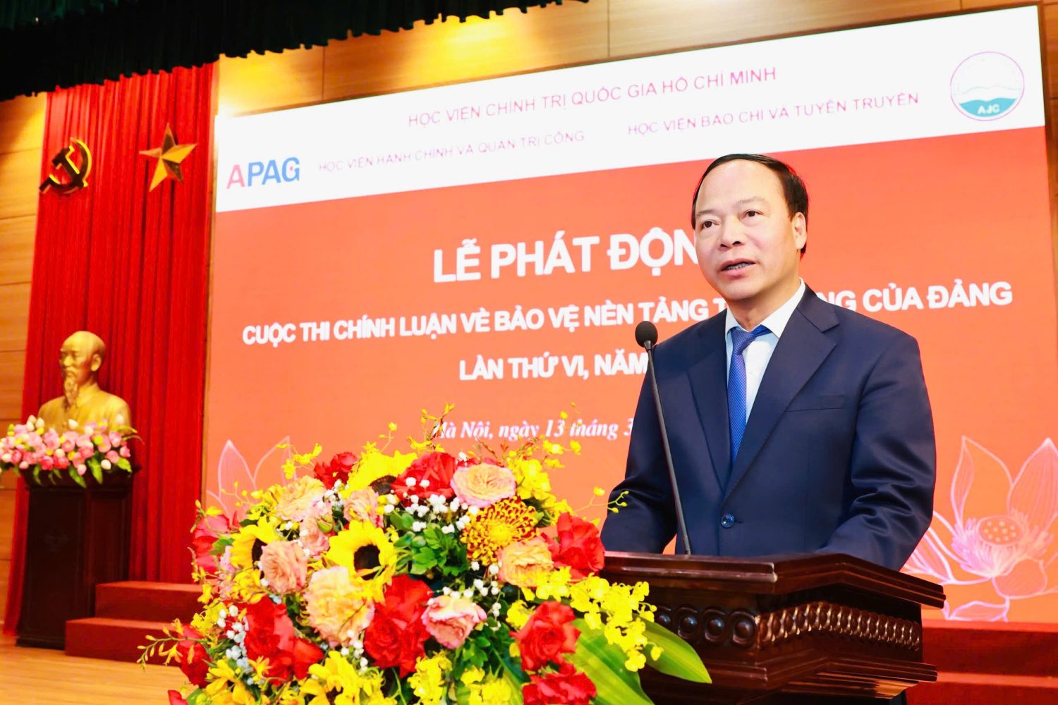 Mượn câu hát “Nhà tôi có treo một lá cờ/Làng tôi có mấy trăm ngọn cờ/Việt Nam có trăm triệu lá cờ/Và tôi chính là một ngọn cờ”, Phó Giám đốc Thường trực Học viện Chính trị quốc gia Hồ Chí Minh hy vọng mỗi thầy cô, đặc biệt là mỗi học viên, mỗi sinh viên, những chủ nhân tương lai của đất nước, hãy “phất cao ngọn cờ” của chính mình trong cuộc thi chính luận bảo vệ nền tảng tư tưởng của Đảng năm 2026, đóng góp xứng đáng vào công cuộc xây dựng chỉnh đốn Đảng, bảo vệ vững chắc trận địa tư tưởng của Đảng trong kỷ nguyên mới – kỷ nguyên vươn mình của dân tộc Việt Nam.