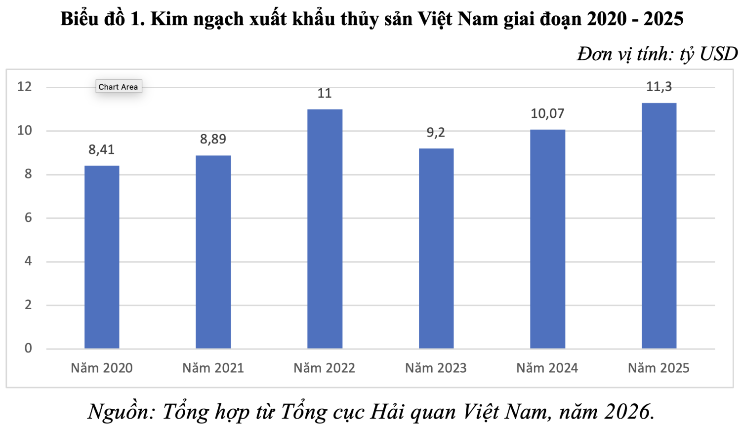 Năm 2020, khó khăn do dịch bệnh Covid-19 đã làm giảm sản lượng thủy sản của Việt Nam, theo đó, kim ngạch xuất khẩu thủy sản cũng giảm xuống 8,41 tỷ USD, giảm 2,21% so với năm 2019. Tuy nhiên, từ năm 2022 đến nay, kim ngạch xuất khẩu thủy sản có sự tăng lên đáng kể. Biểu đồ 1 dưới đây tổng hợp kim ngạch xuất khẩu thủy sản Việt Nam giai đoạn 2020 – 2025.