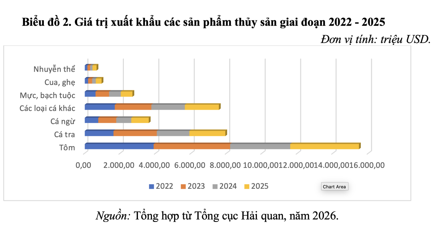 Số liệu tổng hợp cho thấy, tôm vẫn là sản phẩm xuất khẩu chủ lực của Việt Nam theo suốt các giai đoạn phát triển xuất khẩu. Giá trị xuất khẩu cao liên tục qua các năm là tôm, cá tra, cá các loại khác (cá cơm, cá thu, cá nục, cá nước ngọt…). Về tỷ trọng các sản phẩm xuất khẩu, tôm và các sản phẩm từ tôm vẫn là sản phẩm chủ lực áp đảo cả về sản lượng cũng như tỷ trọng trong tổng xuất khẩu thủy sản của Việt Nam. Tỷ trọng tôm chiếm trên 38% trong tổng giá trị thủy sản xuất khẩu giai đoạn 2021 – 2025, kế tiếp là cá tra (chiếm 20%), cá ngừ (19%)…