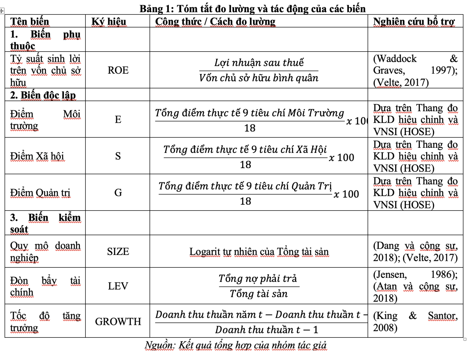 Biến phụ thuộc và Biến kiểm soát. Nghiên cứu sử dụng Tỷ suất sinh lời trên vốn chủ sở hữu (ROE) làm biến đại diện cho hiệu quả tài chính. Để kiểm soát các đặc tính riêng của doanh nghiệp có thể tác động đến mô hình, nghiên cứu sử dụng ba biến kiểm soát, bao gồm: Đòn bẩy tài chính (LEV), Quy mô (SIZE) và Tốc độ tăng trưởng (GROWTH).