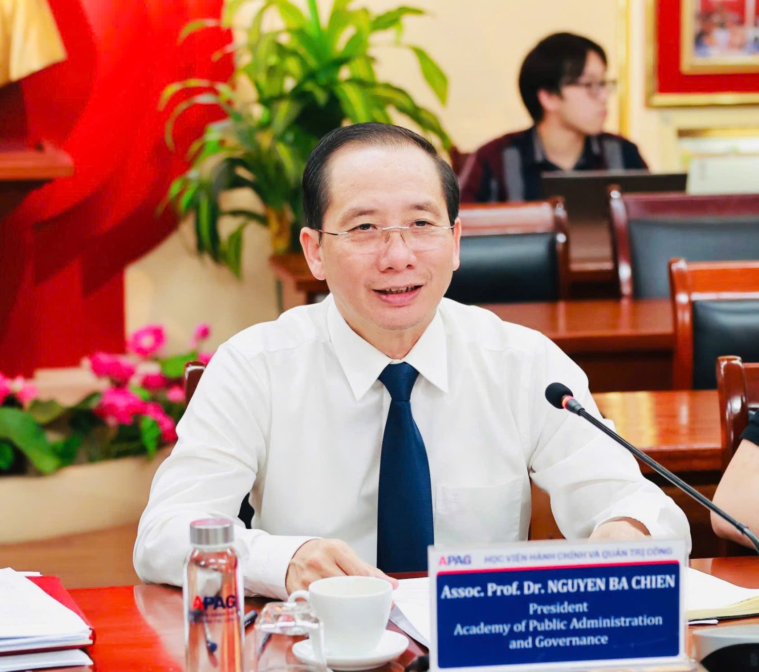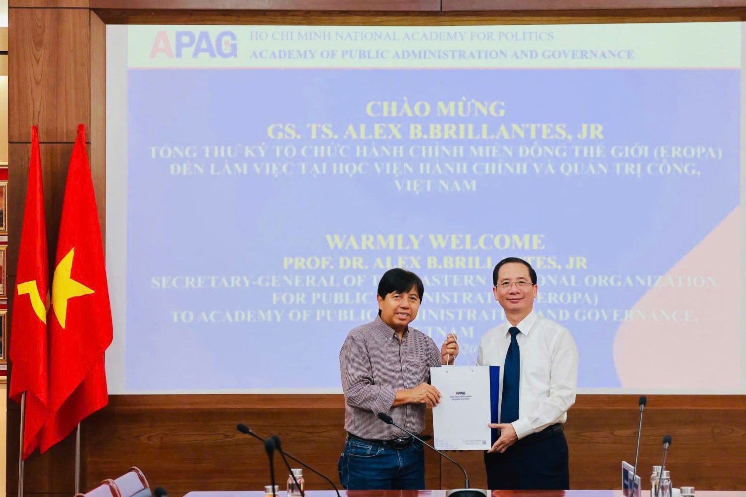 (Quanlynhanuoc.vn) – Chiều ngày 07/4/2026, tại Hà Nội, PGS.TS. Nguyễn Bá Chiến, Giám đốc Học viện Hành chính và Quản trị công (APAG) tiếp và làm việc với Tổng thư ký Tổ chức Hành chính miền Đông thế giới (EROPA). Tham dự buổi làm việc, về phía EROPA, có: TS. Alex Brillantes Jr. Tổng thư ký EROPA cùng các cộng sự. Về phía APAG, có: lãnh đạo các đơn vị thuộc và trực thuộc Học viện; cùng đại diện Ban Quản lý khoa học và Hợp tác quốc tế.