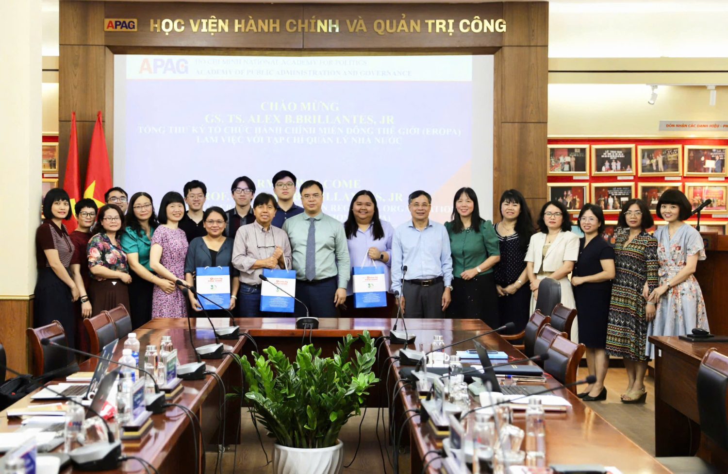 Tham dự buổi làm việc, về phía EROPA, có: GS.TS. Alex Brillantes Jr., Tổng thư ký EROPA; bà Kartherine Ederm – chuyên viên hành chính cao cấp EROPA; bà Ainna Shariz Comia – nghiên cứu viên cao cấp và Quản lý Văn phòng EROPA. Tiếp đoàn, về phía Học viện, có: TS. Nguyễn Quang Vinh, Tổng Biên tập Tạp chí Quản lý nhà nước; ThS. Phạm Thị Quỳnh Hoa, Quyền Trưởng ban Quản lý khoa học và Hợp tác quốc tế; TS. Lê Thị Hoa, Phó Tổng Biên tập Tạp chí Quản lý nhà nước; cùng phóng viên, biên tập viên, viên chức của Tạp chí Quản lý nhà nước và Ban Quản lý Khoa học và Hợp tác quốc tế.