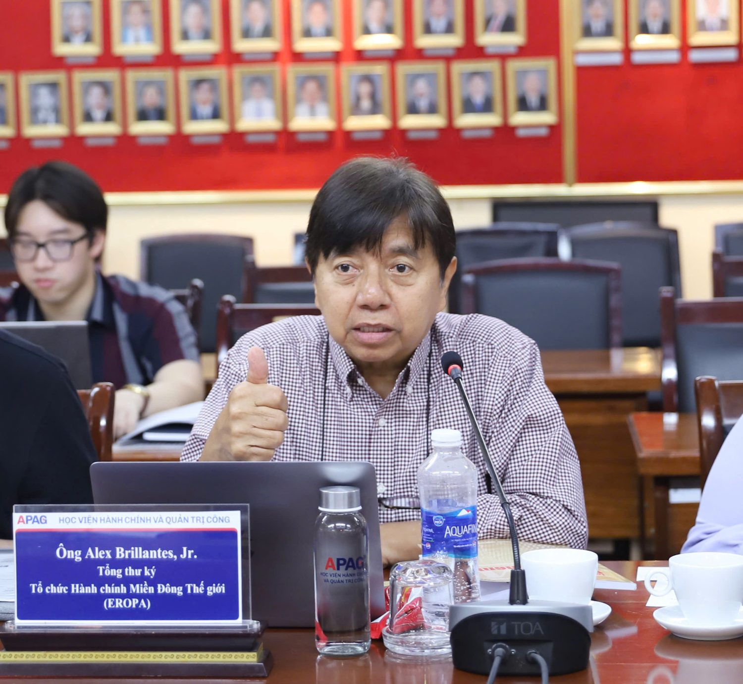TS. Alex Brillantes Jr. nhất trí với các đề xuất của Tạp chí Quản lý nhà nước và nhấn mạnh một số nội dung trọng tâm. Theo đó, tại Hội nghị EROPA dự kiến tổ chức vào tháng 10/2026, sẽ có một phiên chuyên đề riêng về xuất bản tạp chí trong hệ thống Scopus. Bên cạnh đó, ông chia sẻ các điều kiện cơ bản để một tạp chí được đưa vào Scopus; thống nhất việc gắn liên kết website của Tạp chí Quản lý nhà nước trên trang thông tin của EROPA và Tạp chí Hành chính châu Á; đăng tải lời mời viết bài trên các kênh truyền thông của EROPA. Với vai trò và khả năng kết nối của mình, ông cam kết hỗ trợ Tạp chí Quản lý nhà nước thiết lập quan hệ hợp tác với các tạp chí trong khu vực và quốc tế, qua đó, góp phần mở rộng mạng lưới, nâng cao chất lượng học thuật và tạo thêm cơ hội phát triển bền vững cho Tạp chí cũng như các thành viên của EROPA.