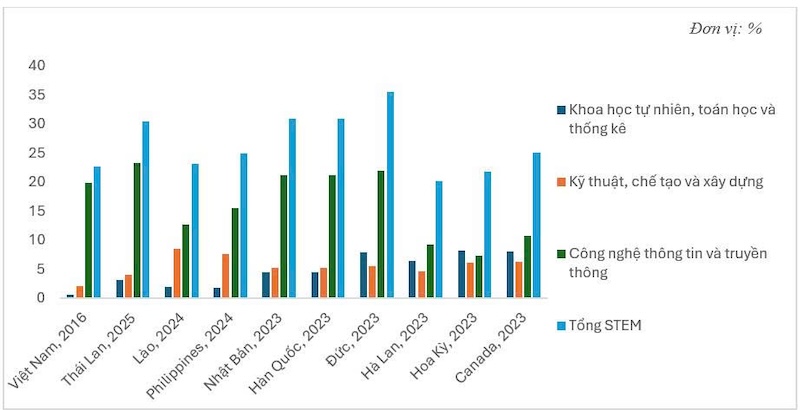 (Ghi chú: STEM bao gồm các ngành khoa học tự nhiên, toán học và thống kê; kỹ thuật, chế tạo và xây dựng; công nghệ thông tin và truyền thông (ICT). Số liệu sử dụng năm gần nhất có dữ liệu của từng quốc gia).