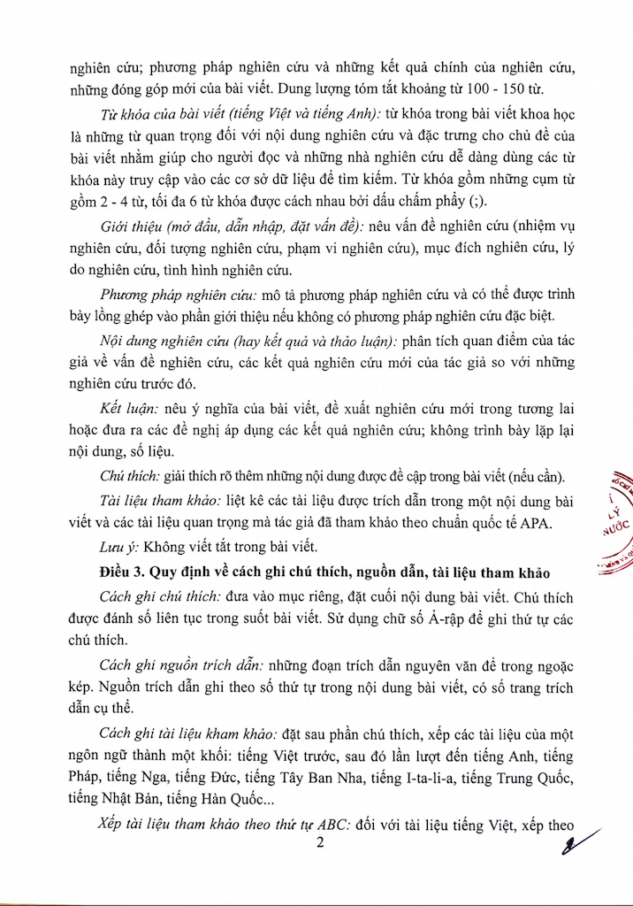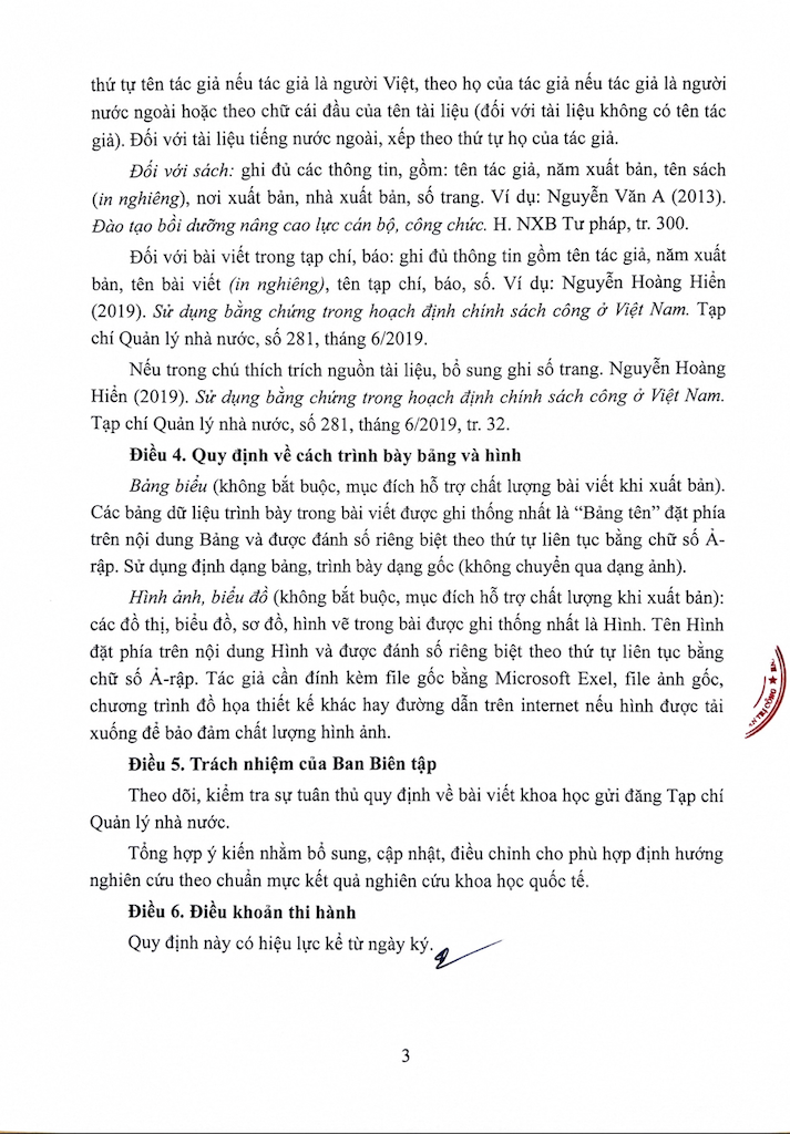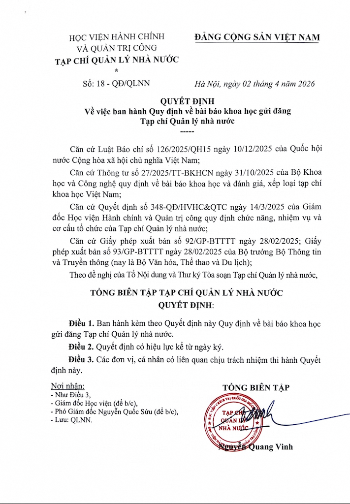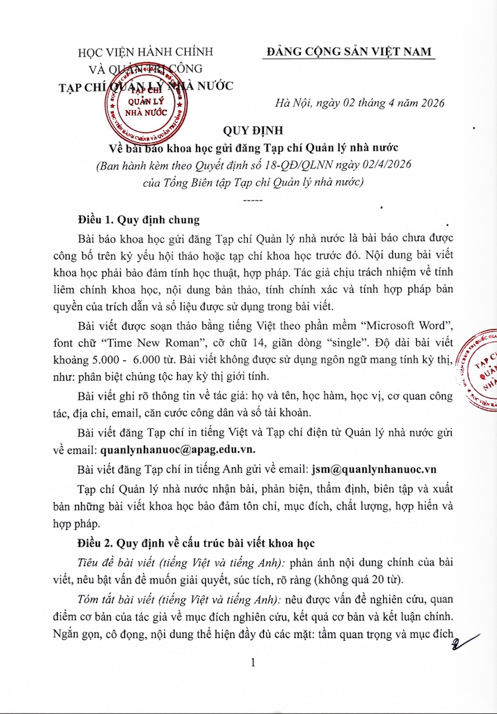 (Quanlynhanuoc.vn) – Bài báo khoa học gửi đăng Tạp chí Quản lý nhà nước là bài báo chưa được công bố trên kỷ yếu hội thảo hoặc tạp chí khoa học trước đó. Nội dung bài viết khoa học phải bảo đảm tính học thuật, hợp pháp. Tác giả chịu trách nhiệm về tính liêm chính khoa học, nội dung bản thảo, tính chính xác và tính hợp pháp bản quyền của trích dẫn và số liệu được sử dụng trong bài viết.