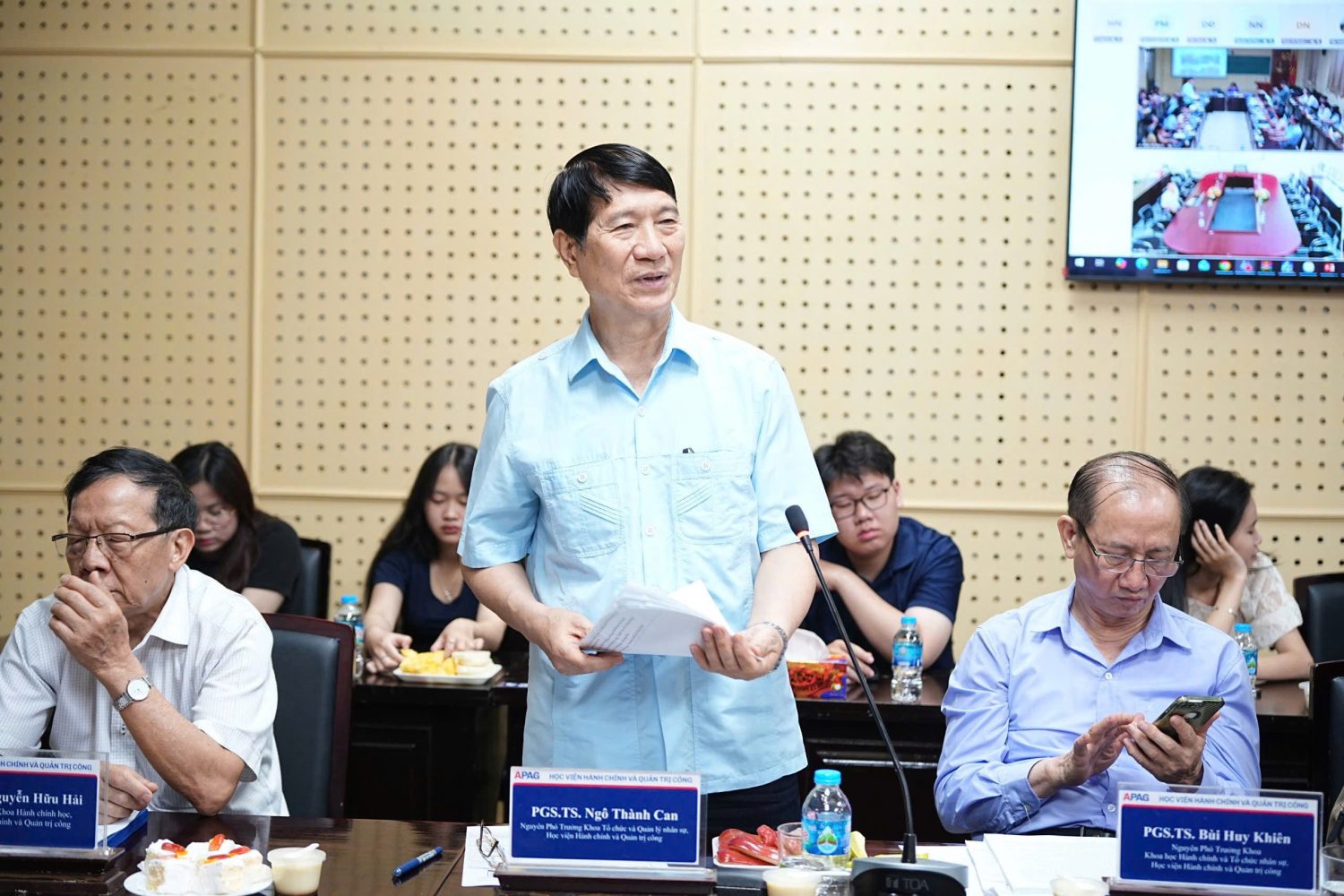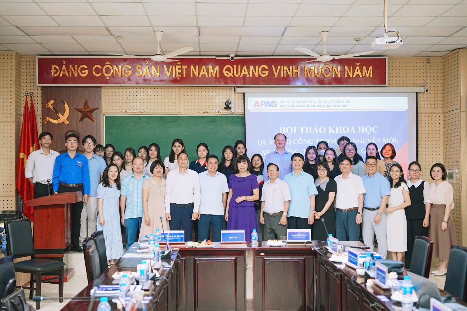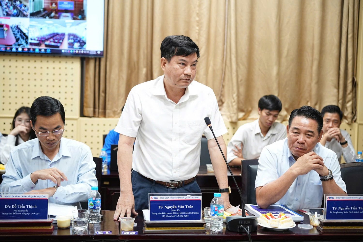 Đại biểu, khách mời dự Hội thảo, có: TS. Bùi Phương Đình, Phó Giám đốc Học viện Hành chính và Quản trị công; TS. Nguyễn Tiến Thành, Bí thư phường Xuân Đỉnh, thành phố Hà Nội; ông Đỗ Tiến Thịnh, Phó Giám đốc xu hướng, thách thức và giải pháp; TS. Nguyễn Văn Trúc, Giám đốc Trung tâm Đào tạo và Hỗ trợ phát triển thị trường, Bộ Khoa học và Công nghệ; TS. Nguyễn Thanh Bình, Trưởng khoa Lãnh đạo Học và Hành chính công, Học viện Chính trị Khu vực I cùng đông đảo các nhà khoa học, giảng viên trong và ngoài Học viện.